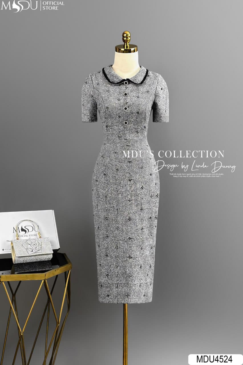Váy Thiết Kế MDU4524 Text Nhật Cao Cấp Dáng Bút Chì Cổ Sơ Mi Tròn Viền Đen – Thanh Lịch, Hiện Đại Và Tinh Tế