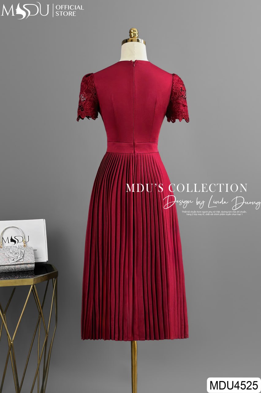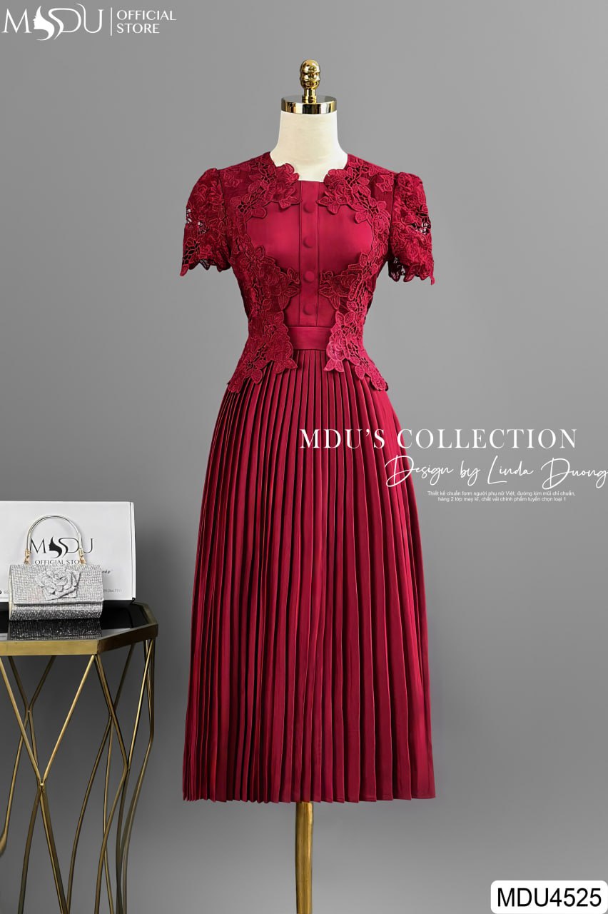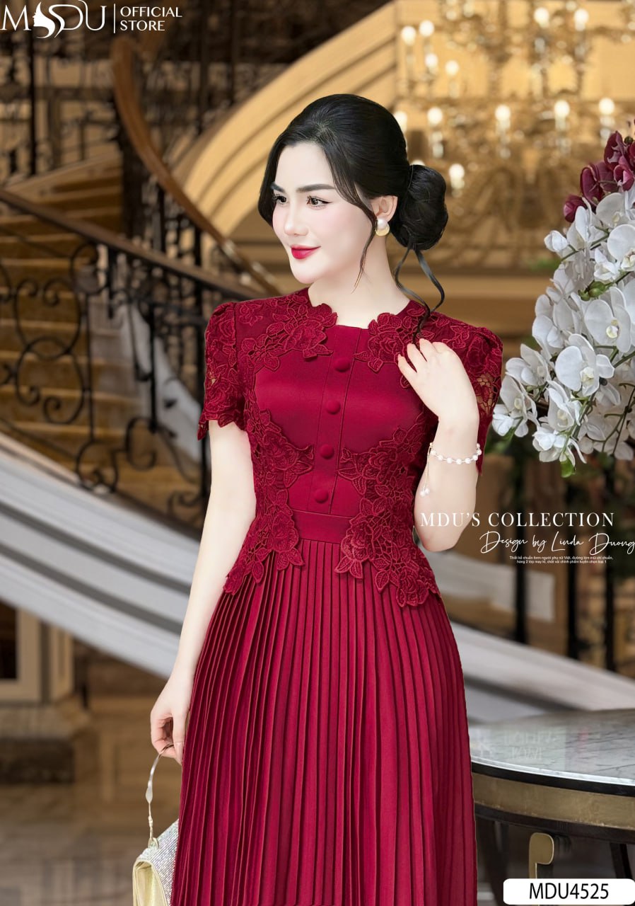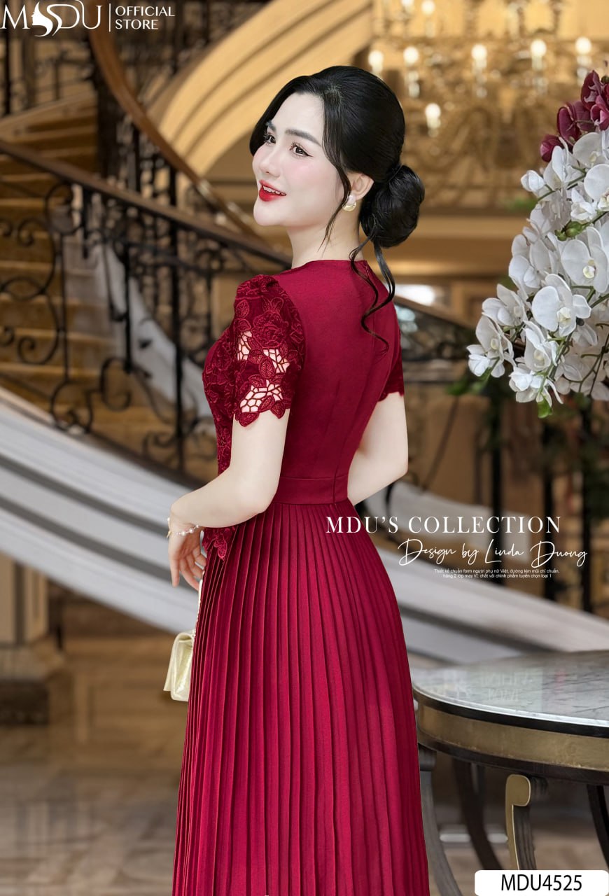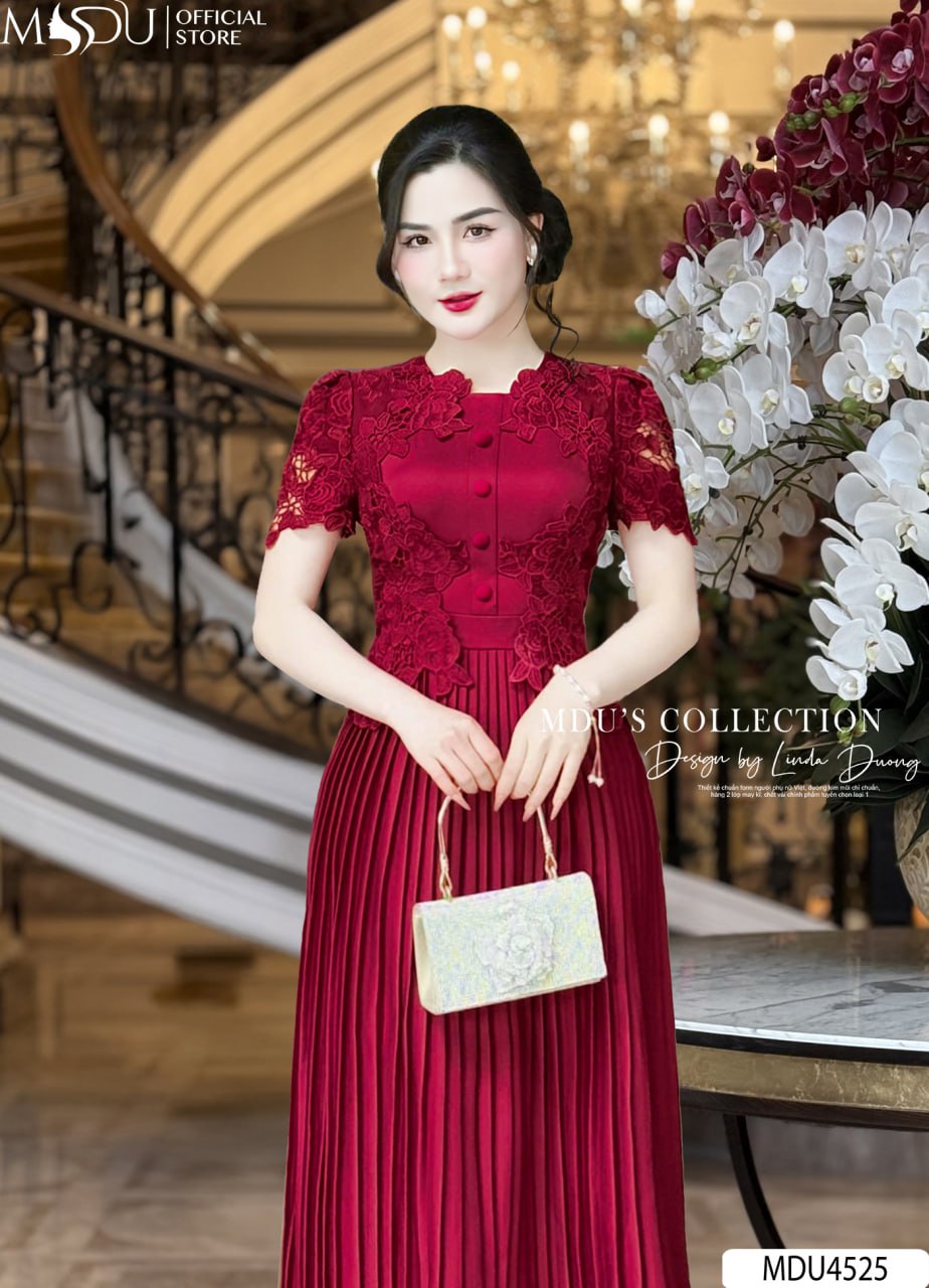 Sắc đỏ đô nổi bật, quý phái giúp váy MDU4525 dễ dàng thu hút mọi ánh nhìn. Thiết kế cổ tròn thanh lịch, tay lửng phối ren tinh tế và chi tiết xếp ly nhẹ nhàng giúp tôn lên vóc dáng, mang lại sự tự tin cho người mặc. Đây là sự lựa chọn lý tưởng để bạn tỏa sáng trong các buổi tiệc hoặc sự kiện quan trọng.