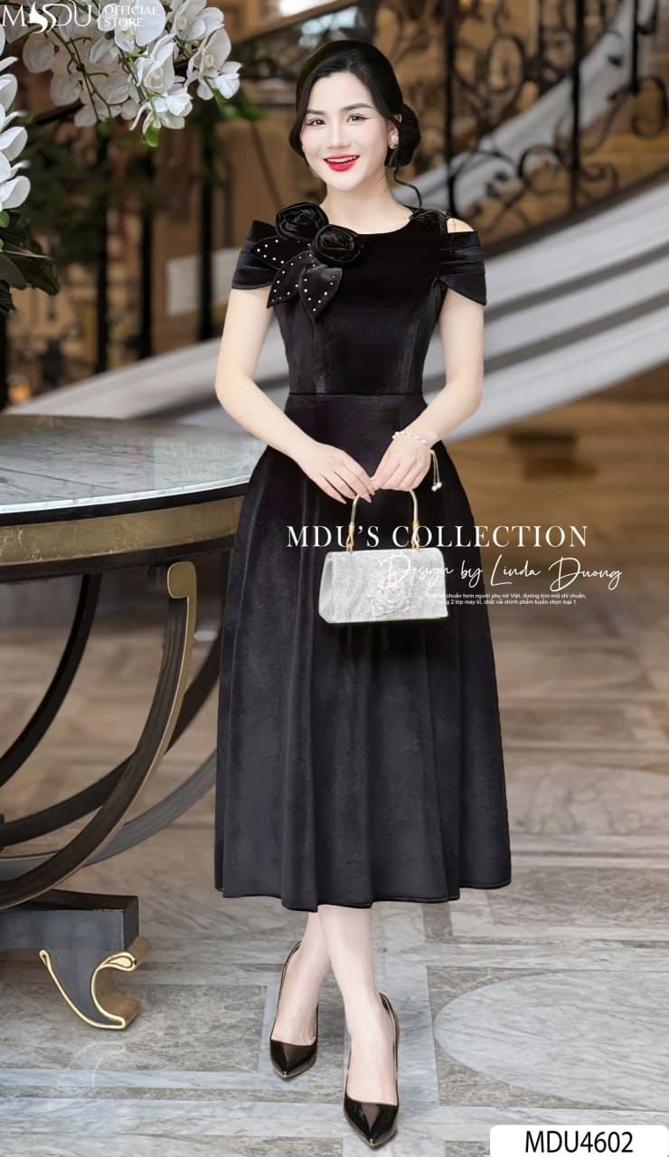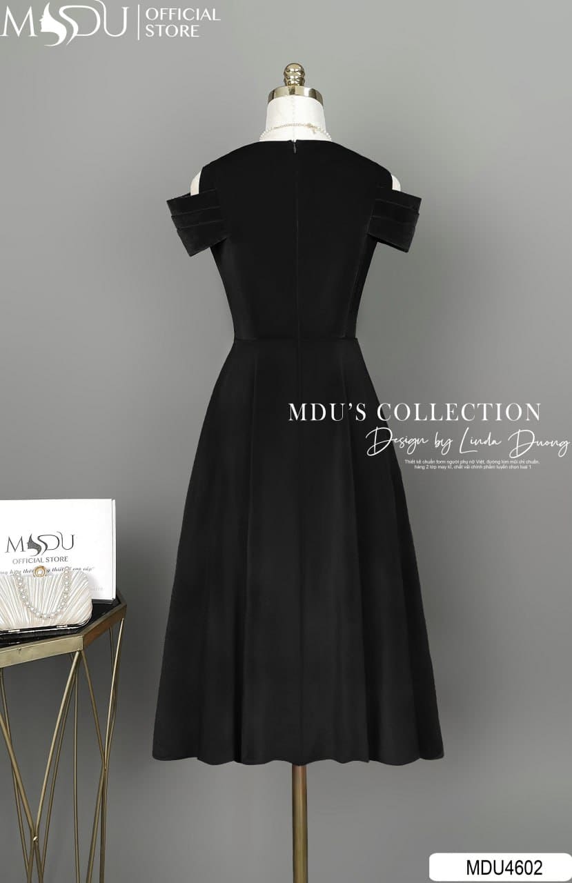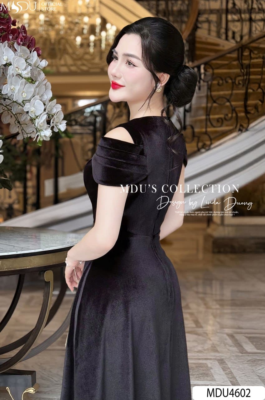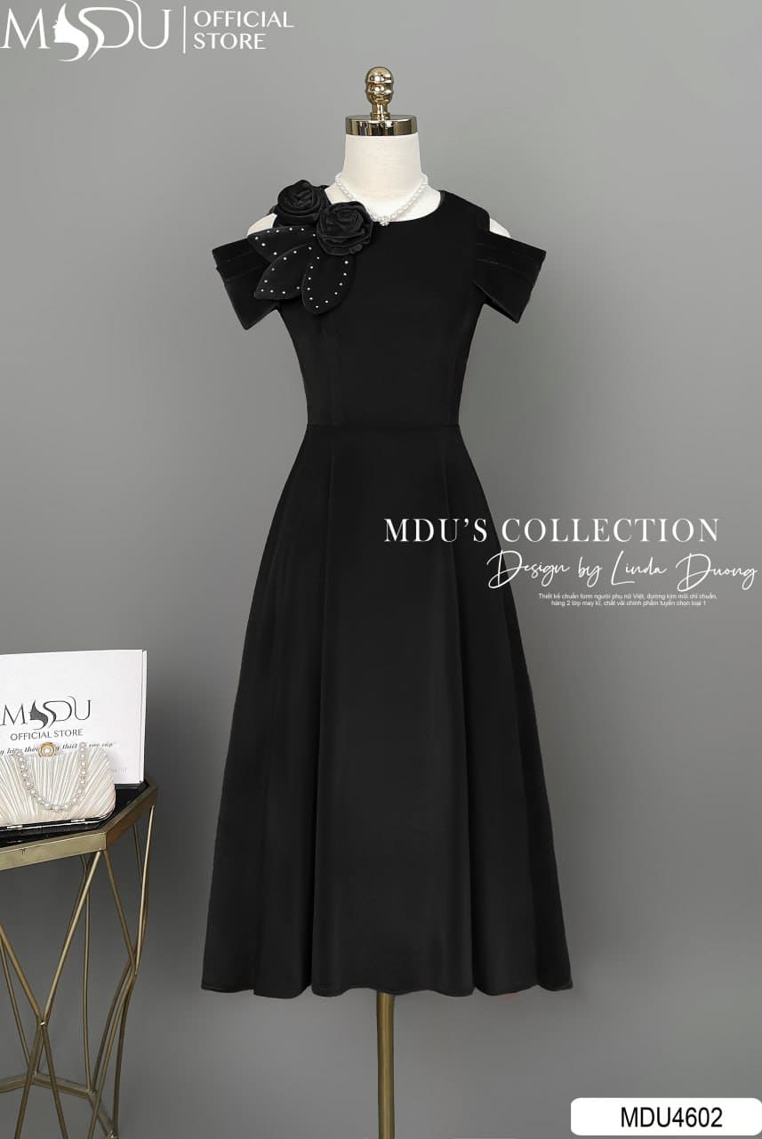 Váy Thiết Kế MDU4602 Nhung Hàn Đen Huyền Bí Vai Cắt Xẻ Đính Hoa Ngọc Trai Sang Trọng