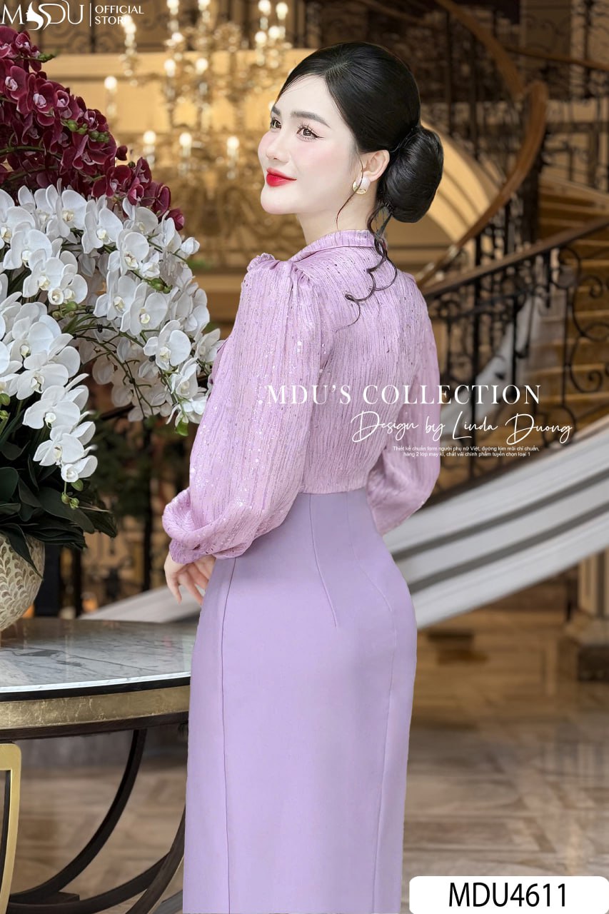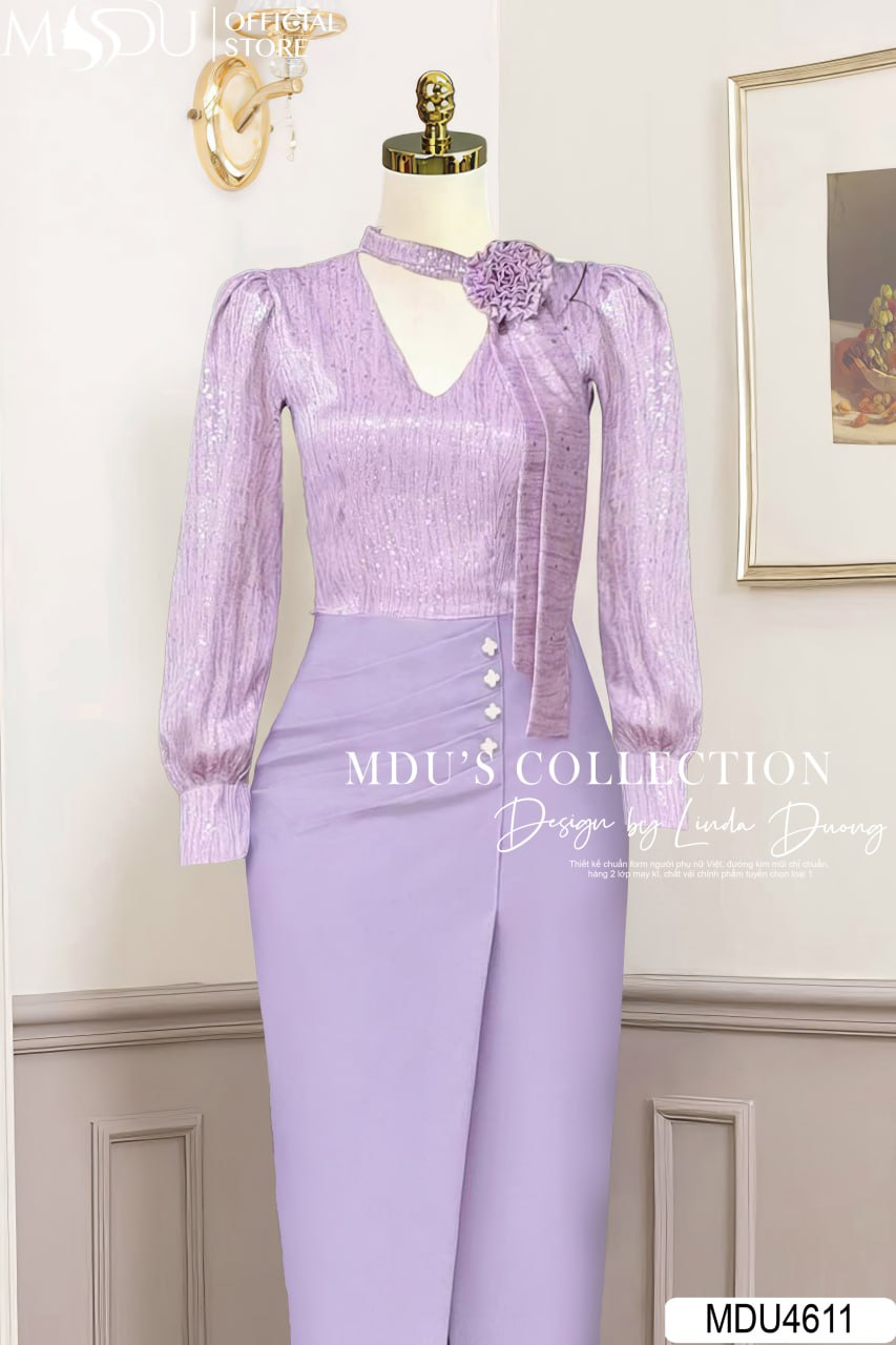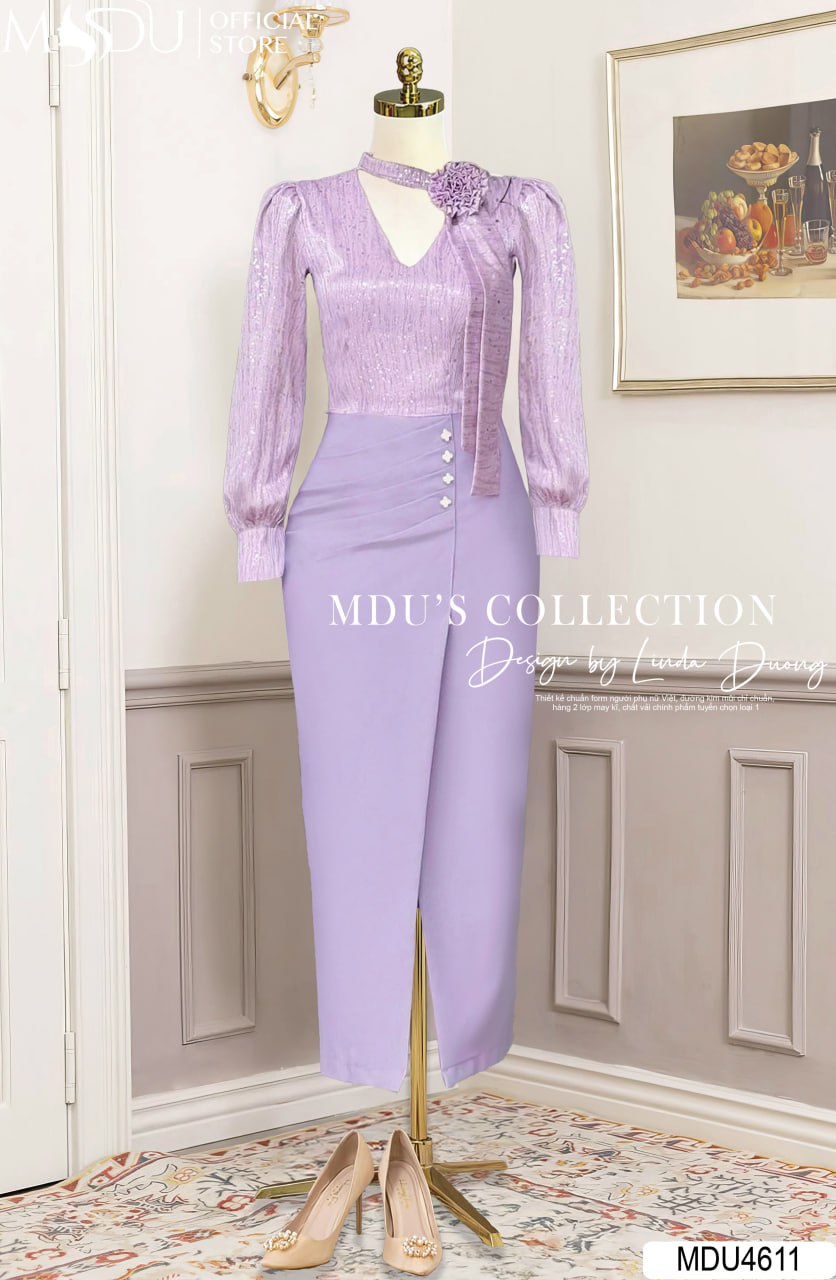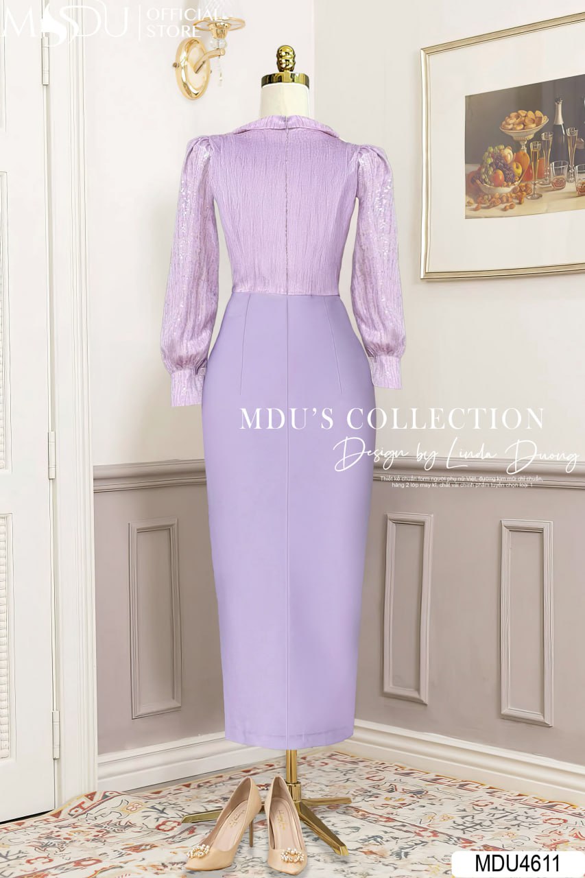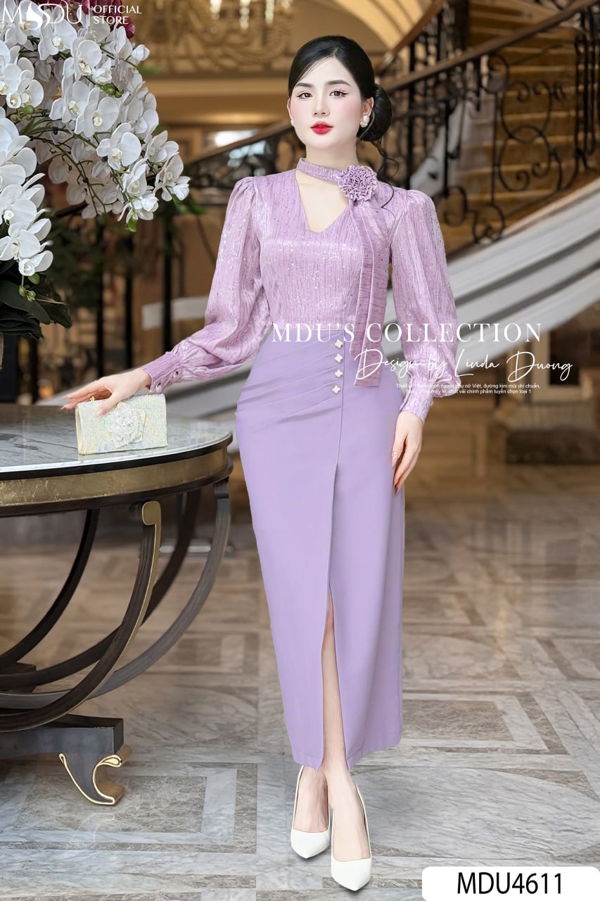 Phần thân váy dưới được thiết kế ôm nhẹ, giúp tôn lên đường cong nhưng vẫn đảm bảo sự thoải mái khi di chuyển. Chi tiết xẻ tà trước mang lại sự thanh thoát, tôn thêm nét nữ tính và tạo hiệu ứng kéo dài đôi chân. Sự kết hợp hoàn hảo giữa chất liệu lụa nhũ và gam màu tím thời thượng giúp MDU4611 trở thành một thiết kế đầy cuốn hút và đẳng cấp.