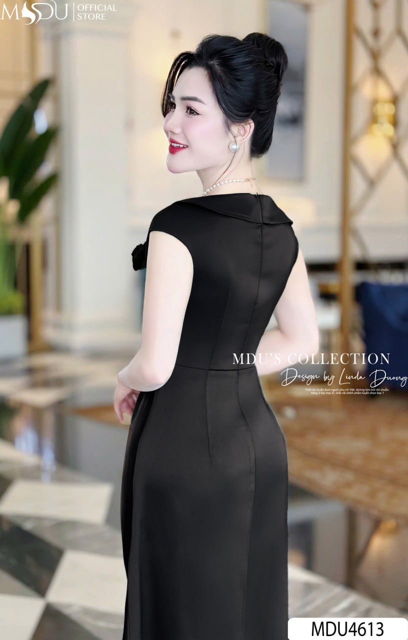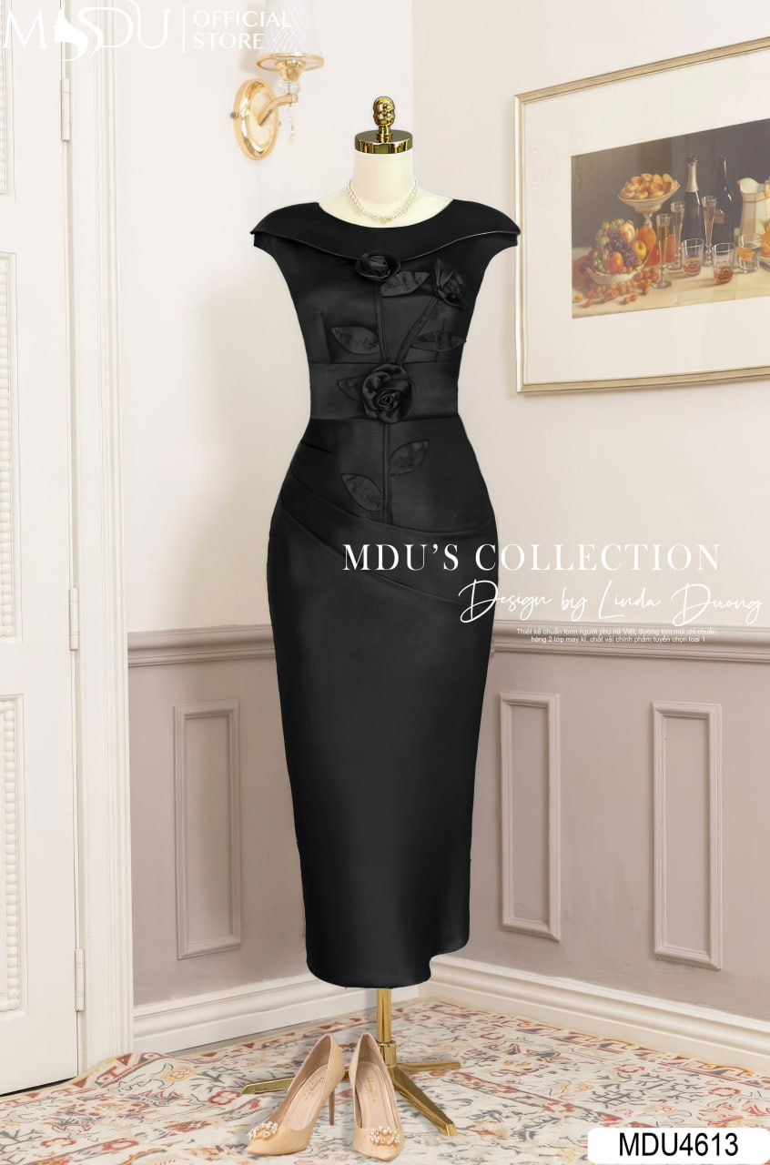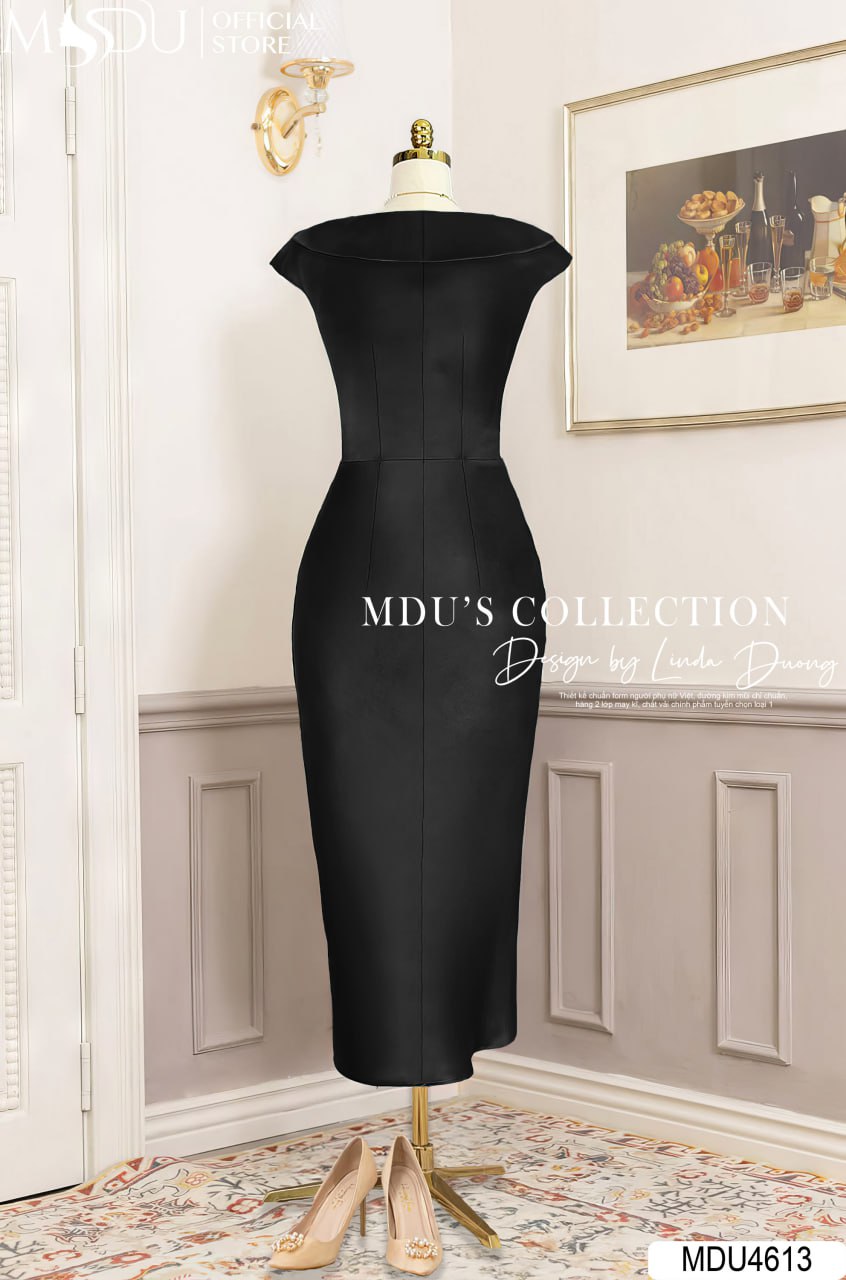 MDU4613 mang sắc đen huyền bí, vừa sang trọng vừa dễ dàng phối hợp với các phụ kiện thời thượng. Điểm nhấn của thiết kế nằm ở phần cổ thuyền độc đáo, mang lại vẻ đẹp nhẹ nhàng nhưng không kém phần ấn tượng. Dáng váy ôm vừa vặn, tôn lên đường cong cơ thể đầy tinh tế, giúp phái đẹp tỏa sáng trong các buổi tiệc, sự kiện quan trọng hoặc các dịp lễ kỷ niệm.