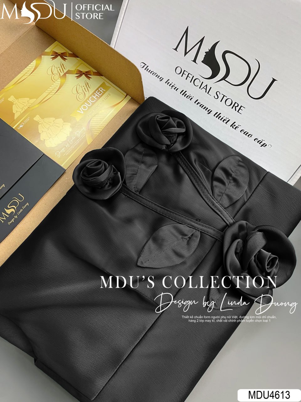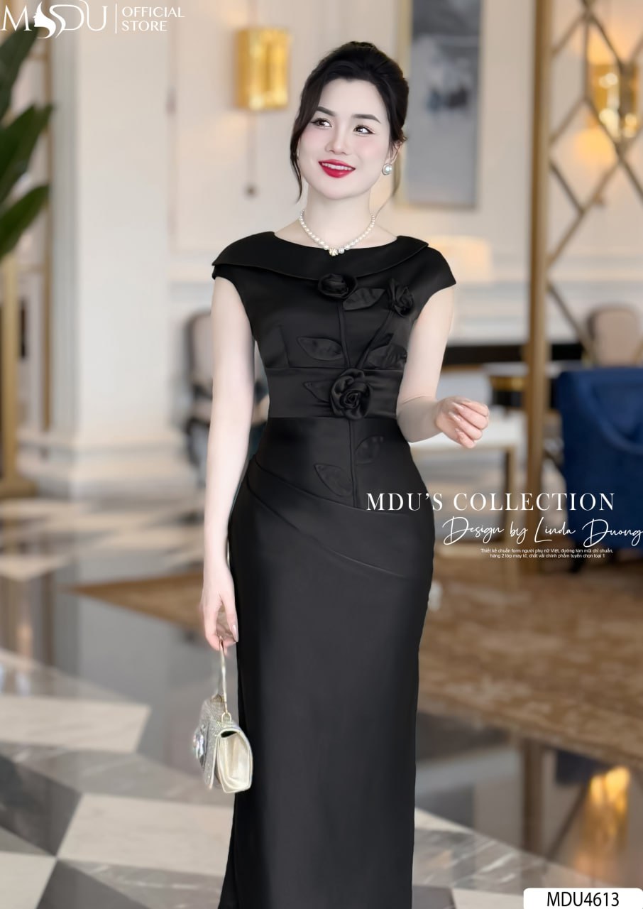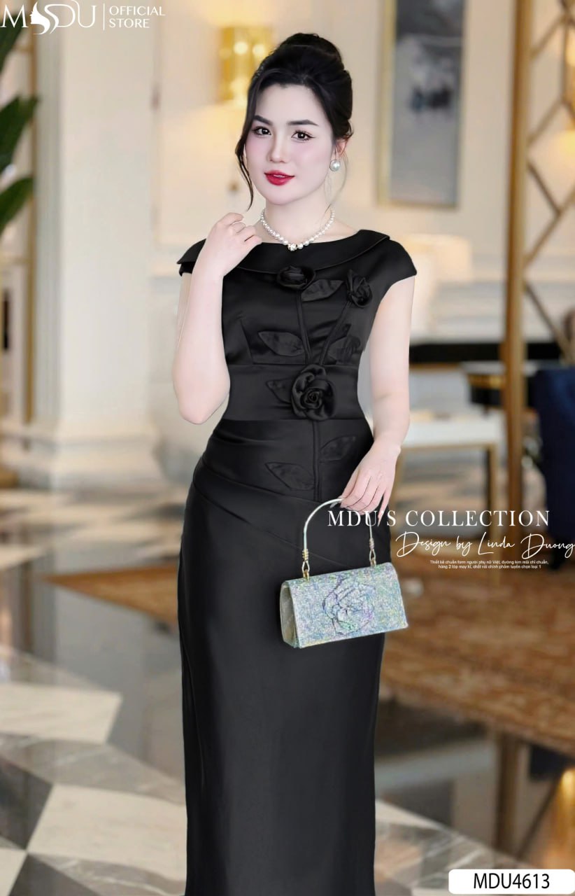 MDU4613 mang sắc đen huyền bí, vừa sang trọng vừa dễ dàng phối hợp với các phụ kiện thời thượng. Điểm nhấn của thiết kế nằm ở phần cổ thuyền độc đáo, mang lại vẻ đẹp nhẹ nhàng nhưng không kém phần ấn tượng. Dáng váy ôm vừa vặn, tôn lên đường cong cơ thể đầy tinh tế, giúp phái đẹp tỏa sáng trong các buổi tiệc, sự kiện quan trọng hoặc các dịp lễ kỷ niệm.