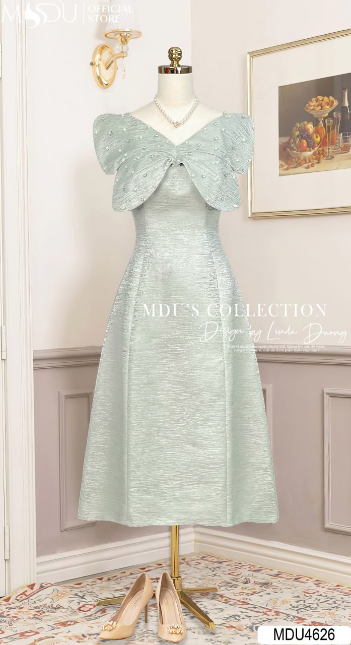 Mẫu váy sử dụng gam màu xanh mint tươi mới, tạo cảm giác nhẹ nhàng, thanh lịch. Điểm nhấn nổi bật chính là chiếc nơ đính ngọc thủ công trước ngực, giúp tôn lên vẻ đẹp kiêu sa và thu hút mọi ánh nhìn, khẳng định phong cách thời thượng của bạn.