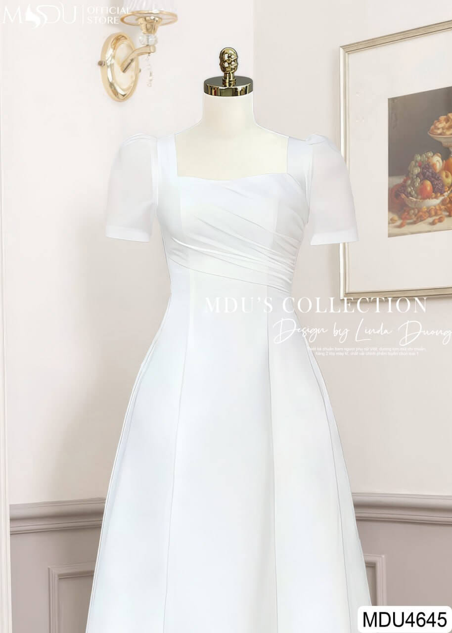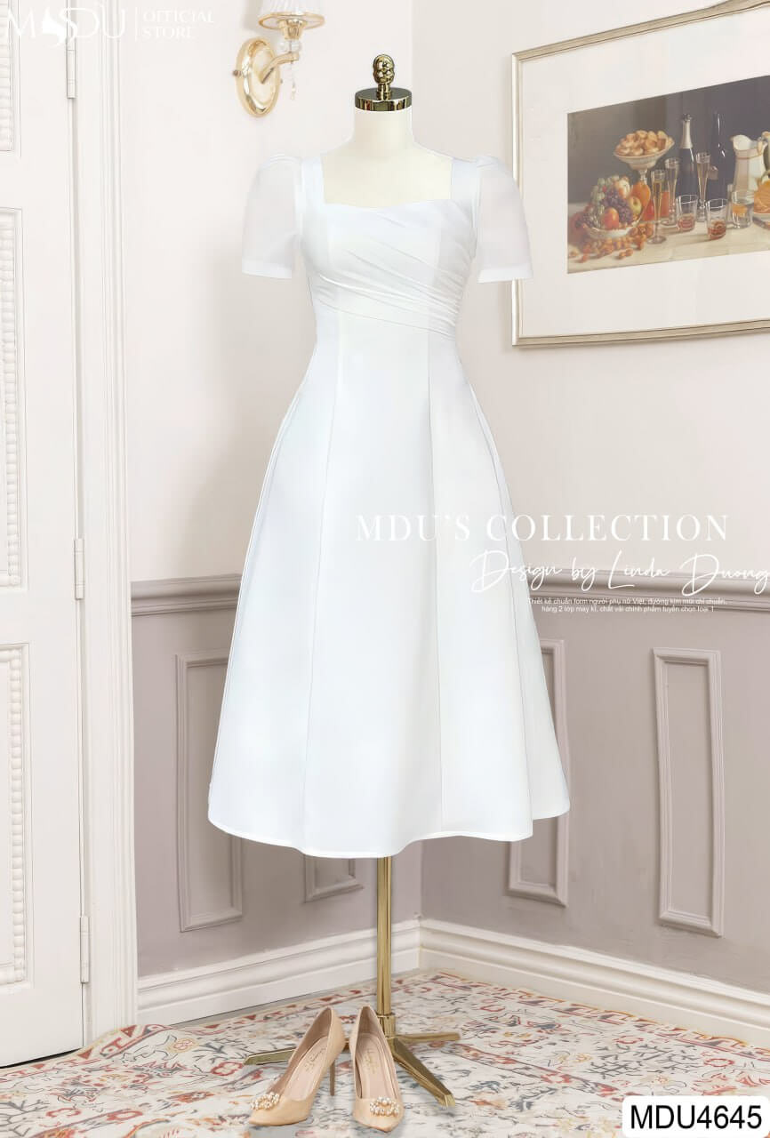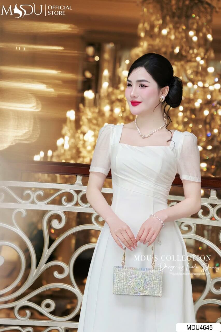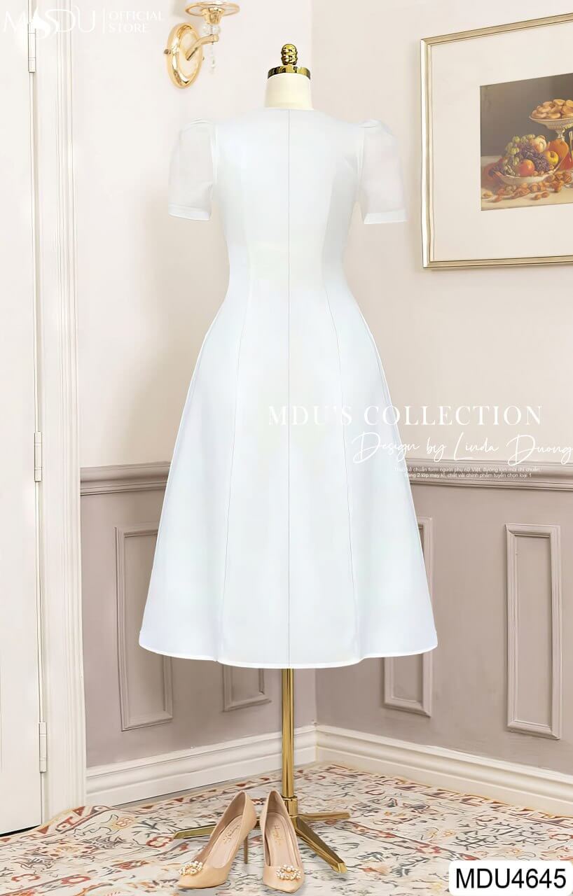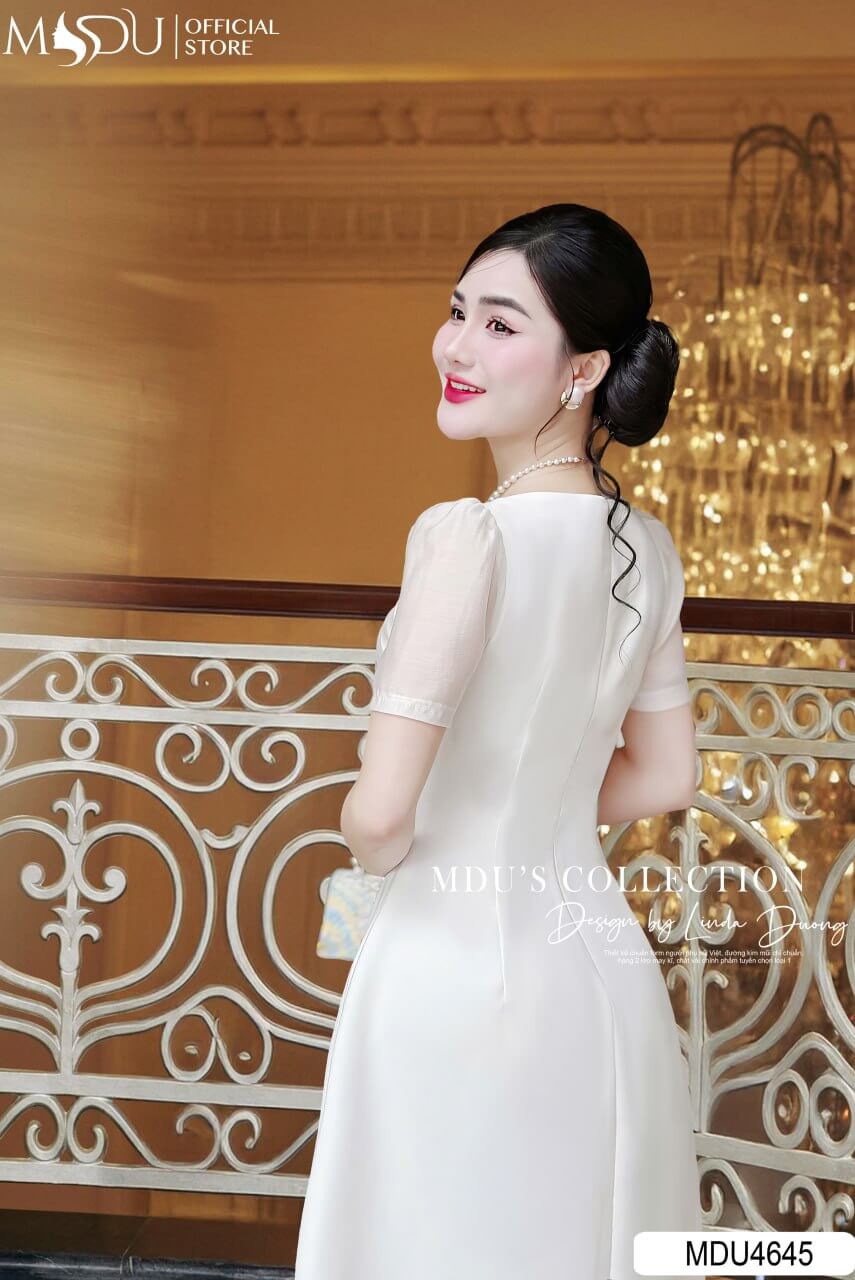 Màu trắng của MDU4645 thể hiện sự thanh thoát, nhẹ nhàng nhưng không kém phần cuốn hút. Thiết kế dáng xòe nữ tính, kết hợp với phần tay may tinh tế và đường xếp ly duyên dáng, tạo nên vẻ ngoài thanh lịch và duyên dáng cho người mặc.