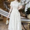 Thiết kế cổ tròn giúp tôn lên nét thanh thoát của phần cổ và vai, mang đến vẻ đẹp trang nhã nhưng không kém phần hiện đại. Chi tiết hoa eo là điểm nhấn tinh tế, giúp tạo hiệu ứng thon gọn, tôn lên vòng eo quyến rũ. Dáng váy xòe nhẹ nhàng mang đến sự mềm mại, giúp nàng tự tin sải bước với phong thái yêu kiều.