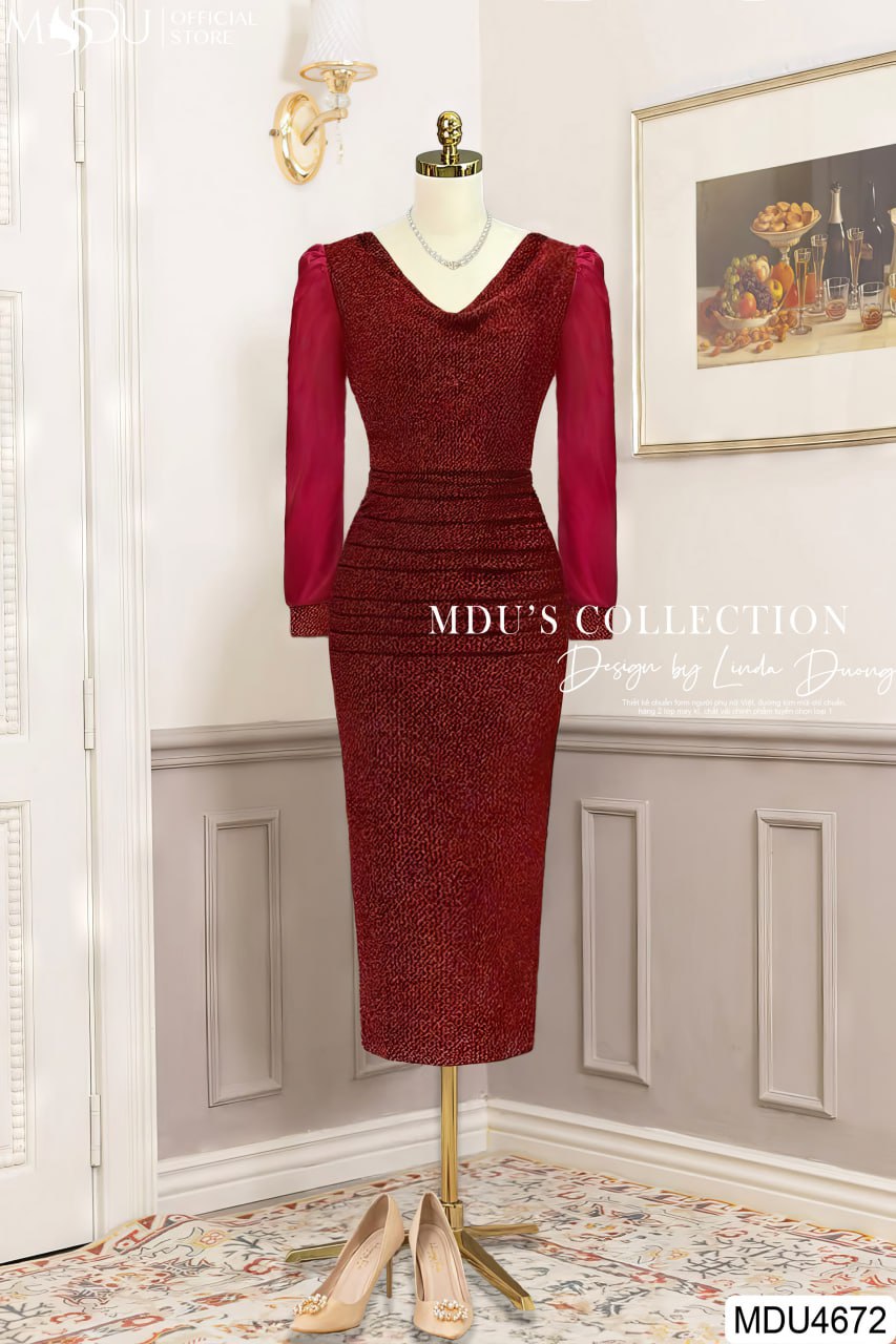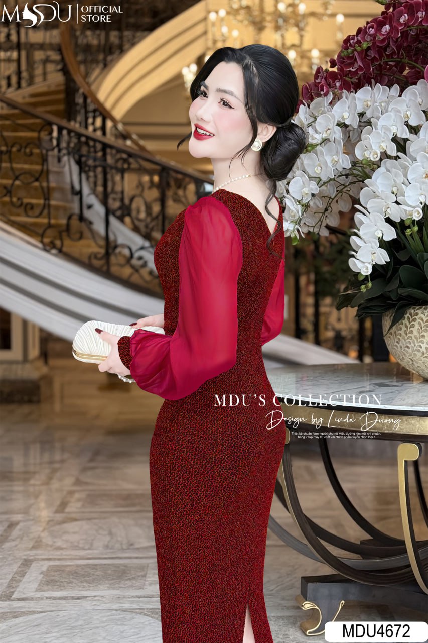 Dáng váy ôm sát giúp tôn lên đường cong mềm mại, tạo hiệu ứng vóc dáng thon gọn và quyến rũ. Tay dài bồng nhẹ tạo điểm nhấn thanh thoát, giúp cân bằng tổng thể trang phục, mang đến vẻ đẹp vừa kiêu kỳ vừa hiện đại. Với chi tiết nhấn eo tinh tế, MDU4672 là lựa chọn hoàn hảo cho những buổi tiệc sang trọng, dạ hội hay những dịp cần một diện mạo nổi bật, cuốn hút.