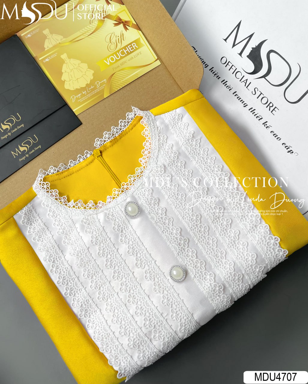 MDU4707 sở hữu dáng tay bồng nhẹ nhàng, kết hợp với phần ngực phối ren độc đáo và hàng cúc ngọc tinh tế, mang đến vẻ đẹp vừa mềm mại vừa sang trọng. Phần eo được chiết nhẹ giúp tôn lên vòng eo thon gọn, tạo hiệu ứng dáng vóc thanh thoát, quyến rũ.