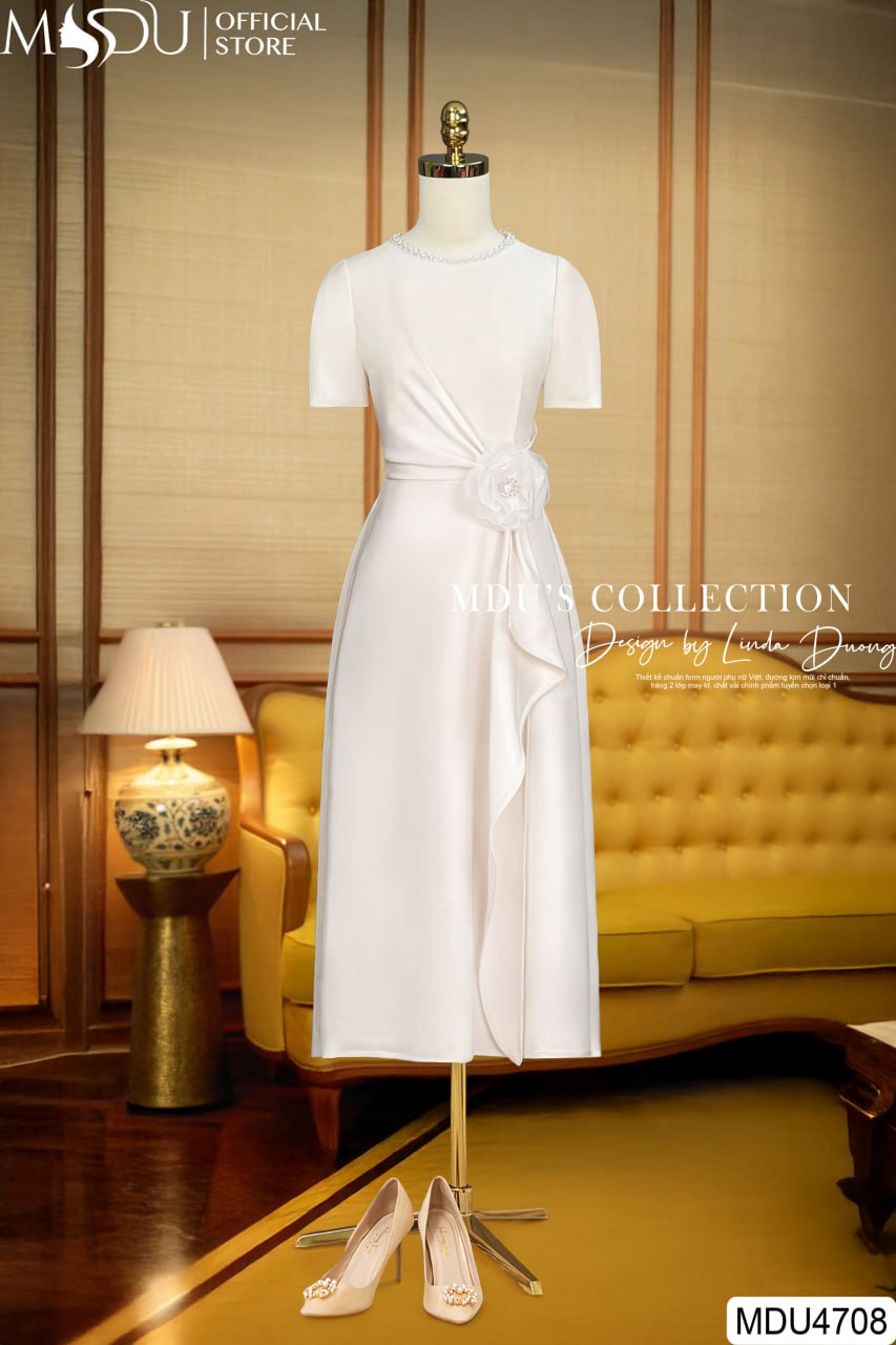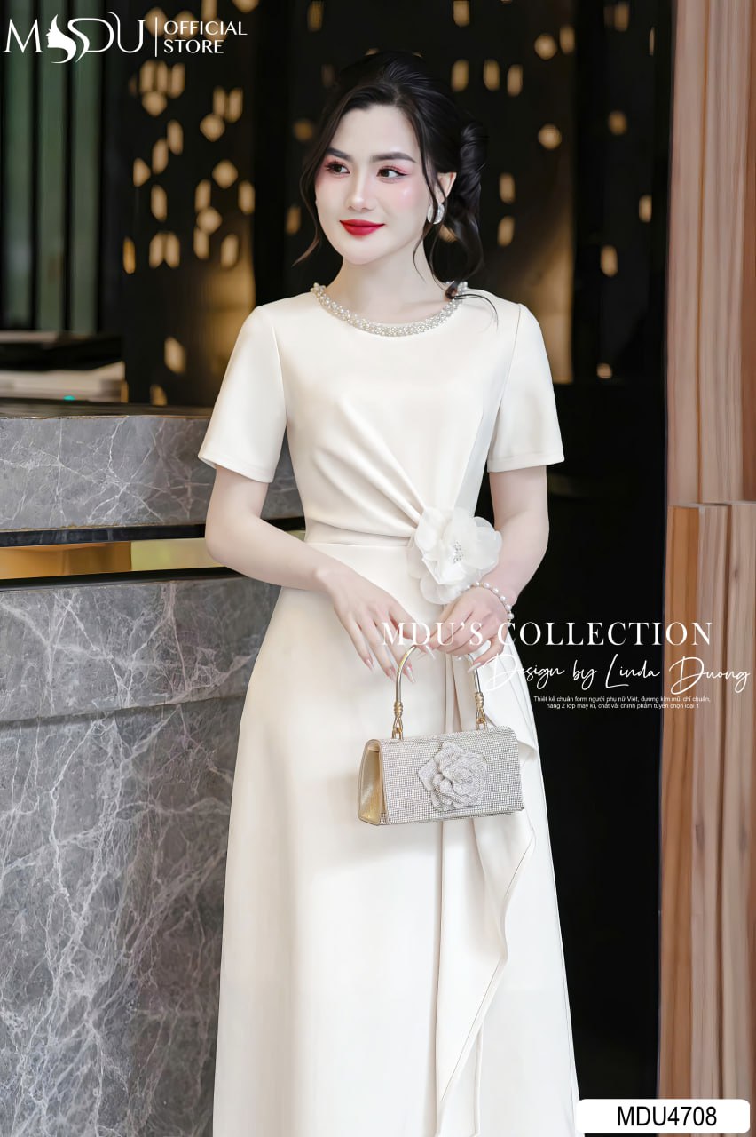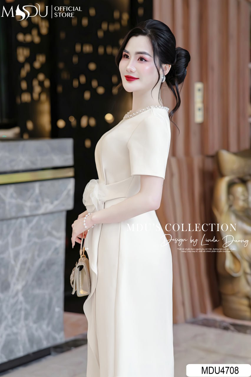 Phần eo được điểm xuyết bởi chi tiết hoa 3D trắng kem tháo rời, được uốn thủ công tinh xảo, khéo léo tôn lên vòng eo thon gọn, đồng thời mang đến nét mềm mại và duyên dáng. Thiết kế MDU4708 với cổ tròn đính ngọc trai sang trọng và tà xếp bất đối xứng bay bổng không chỉ tăng thêm sự cuốn hút mà còn tạo nên một khí chất thanh lịch, giúp chiếc váy trở thành lựa chọn hoàn hảo cho những dịp quan trọng, để nàng luôn nổi bật và thu hút mọi ánh nhìn.