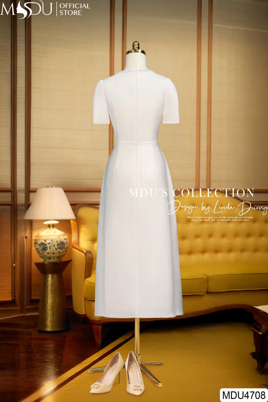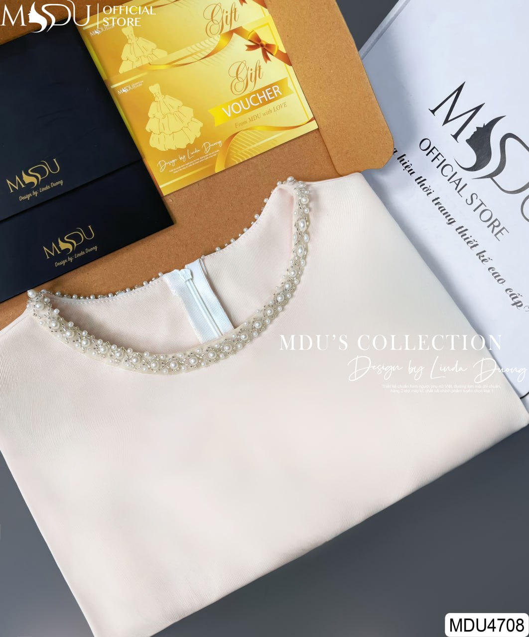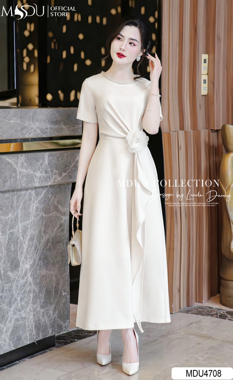 Phần eo được điểm xuyết bởi chi tiết hoa 3D trắng kem tháo rời, được uốn thủ công tinh xảo, khéo léo tôn lên vòng eo thon gọn, đồng thời mang đến nét mềm mại và duyên dáng. Thiết kế MDU4708 với cổ tròn đính ngọc trai sang trọng và tà xếp bất đối xứng bay bổng không chỉ tăng thêm sự cuốn hút mà còn tạo nên một khí chất thanh lịch, giúp chiếc váy trở thành lựa chọn hoàn hảo cho những dịp quan trọng, để nàng luôn nổi bật và thu hút mọi ánh nhìn.