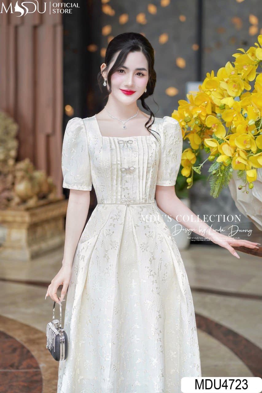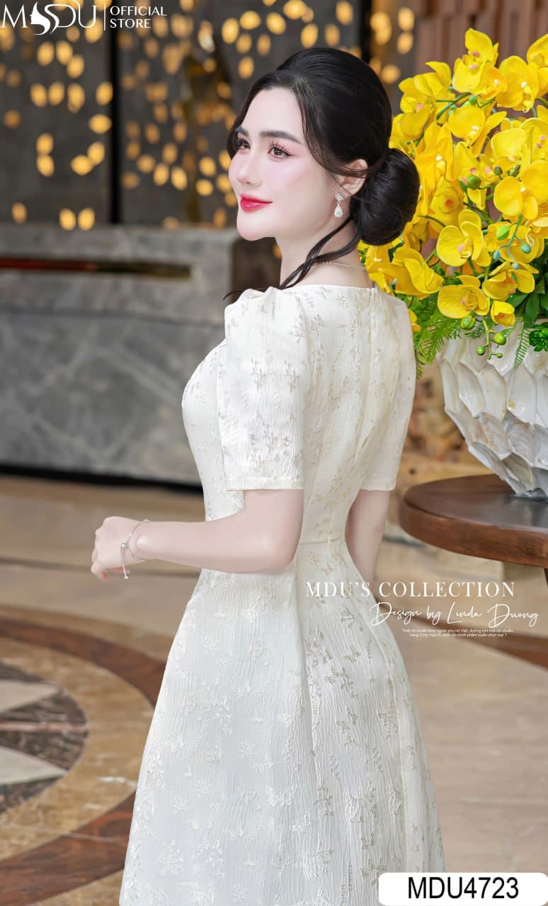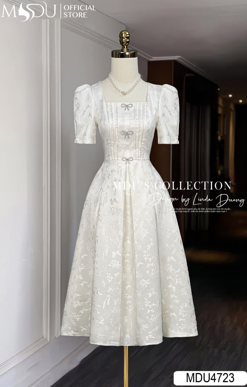 Điểm nhấn của MDU4723 nằm ở thiết kế cổ vuông cổ điển, tôn lên nét thanh tú của vai và xương quai xanh, mang đến khí chất quý phái. Xếp dọc trước thẻ kết hợp nơ đá đính kèm tạo ứng dụng nổi bật, linh hoạt thay đổi theo sở thích. Kiểu váy xòe nhẹ nhàng với tay phồng nhẹ nhàng che điểm, tôn tạo tối ưu.