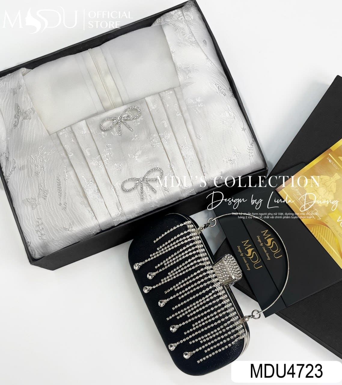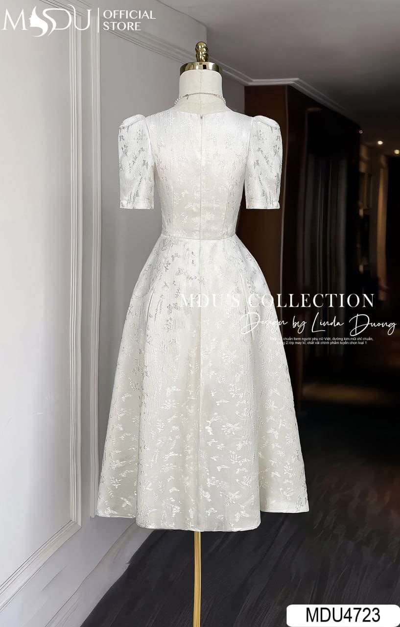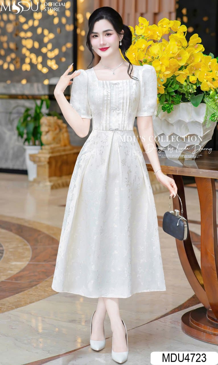 Điểm nhấn của MDU4723 nằm ở thiết kế cổ vuông cổ điển, tôn lên nét thanh tú của vai và xương quai xanh, mang đến khí chất quý phái. Xếp dọc trước thẻ kết hợp nơ đá đính kèm tạo ứng dụng nổi bật, linh hoạt thay đổi theo sở thích. Kiểu váy xòe nhẹ nhàng với tay phồng nhẹ nhàng che điểm, tôn tạo tối ưu.
