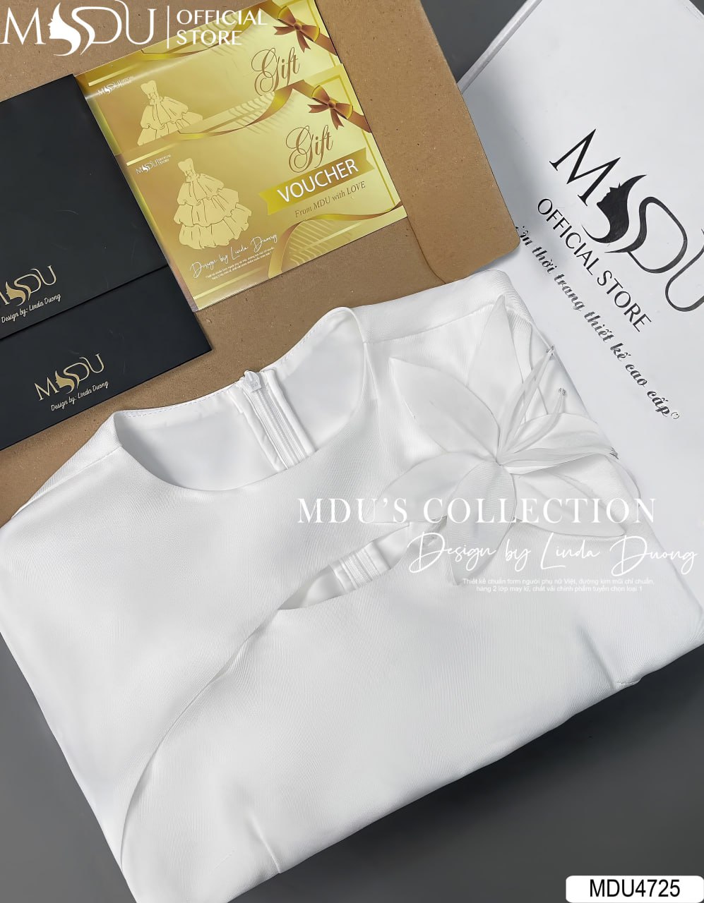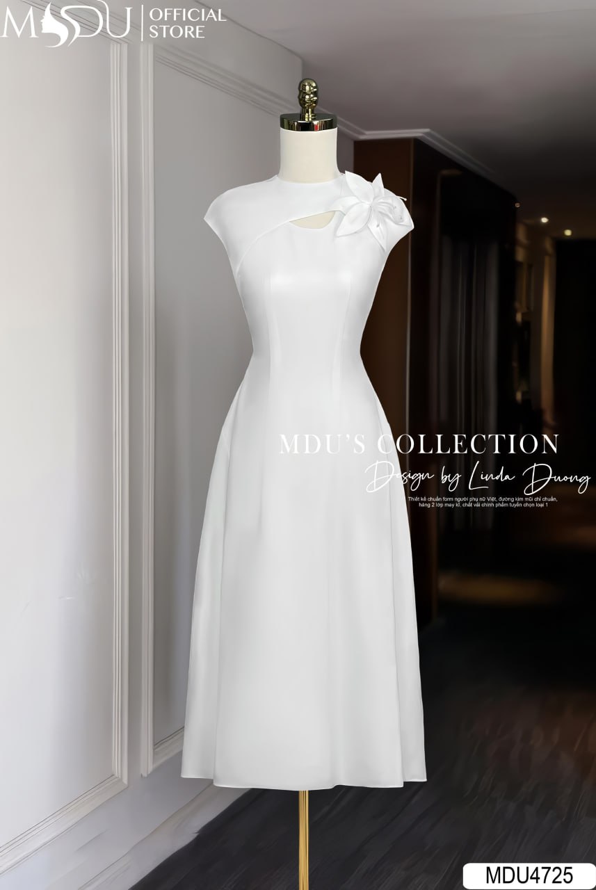 Gam màu trắng thanh lịch mang lại vẻ đẹp tinh khôi, sang trọng, dễ dàng tôn lên làn da và phù hợp với nhiều sự kiện quan trọng. Khi kết hợp cùng chi tiết hoa 3D thủ công đặt khéo léo trên vai, MDU4725 tạo điểm nhìn đầy cuốn hút, giúp nàng nổi bật mà vẫn giữ được nét trang nhã, hiện đại.