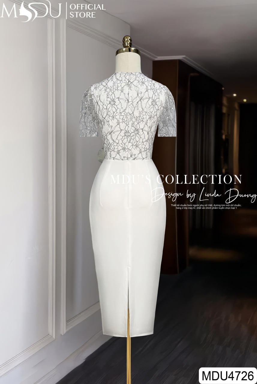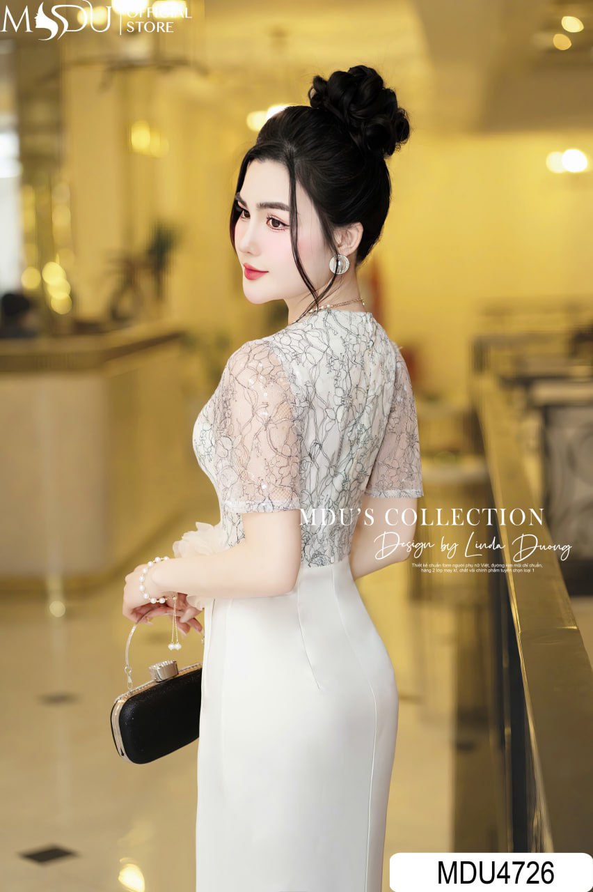 Thiết kế cổ tròn kín đáo mang lại nét dịu dàng, thanh lịch, trong khi phần tay lưới ren thêu hoa tinh xảo tạo nên sự mềm mại và bay bổng. Điểm nhấn nổi bật của MDU4726 nằm ở đai eo đính hoa 3D khéo léo, có thể tháo rời, vừa tôn lên vòng eo thon gọn vừa tạo điểm nhìn thu hút đầy nghệ thuật. Sự kết hợp giữa chất ren cao cấp và các chi tiết thủ công tỉ mỉ mang đến một tuyệt phẩm hoàn hảo, dành cho những quý cô yêu thích phong cách tinh tế, thanh lịch nhưng vẫn toát lên khí chất quyền quý.