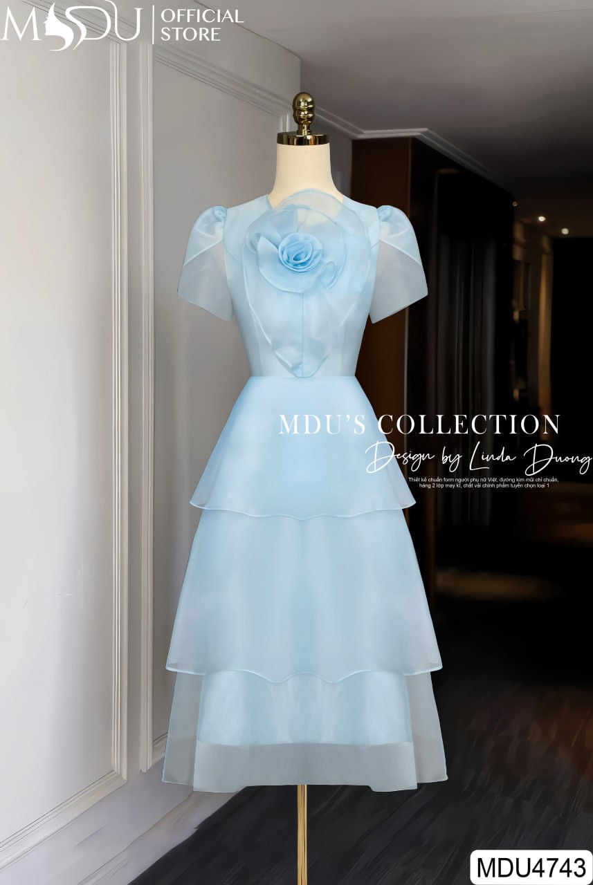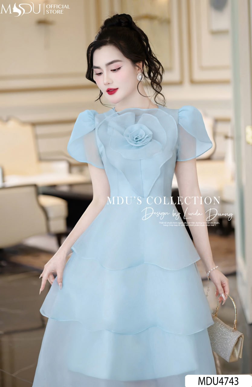 Điểm nhấn nổi bật của MDU4743 nằm ở họa tiết hoa 3D tinh xảo được đính kết tỉ mỉ ở phần ngực, tạo nên nét nghệ thuật độc đáo và sang trọng. Phần tay bồng xuyên thấu duyên dáng được thiết kế khéo léo, vừa mềm mại vừa tôn lên sự nữ tính. Phần chân váy layer tầng mềm mại, bồng bềnh, không chỉ tạo độ bay bổng mà còn giúp tôn dáng một cách hoàn hảo.