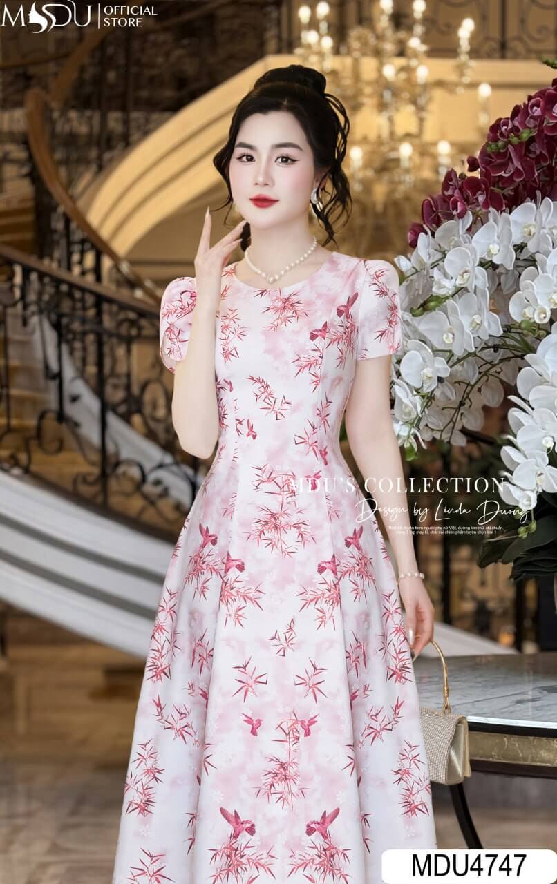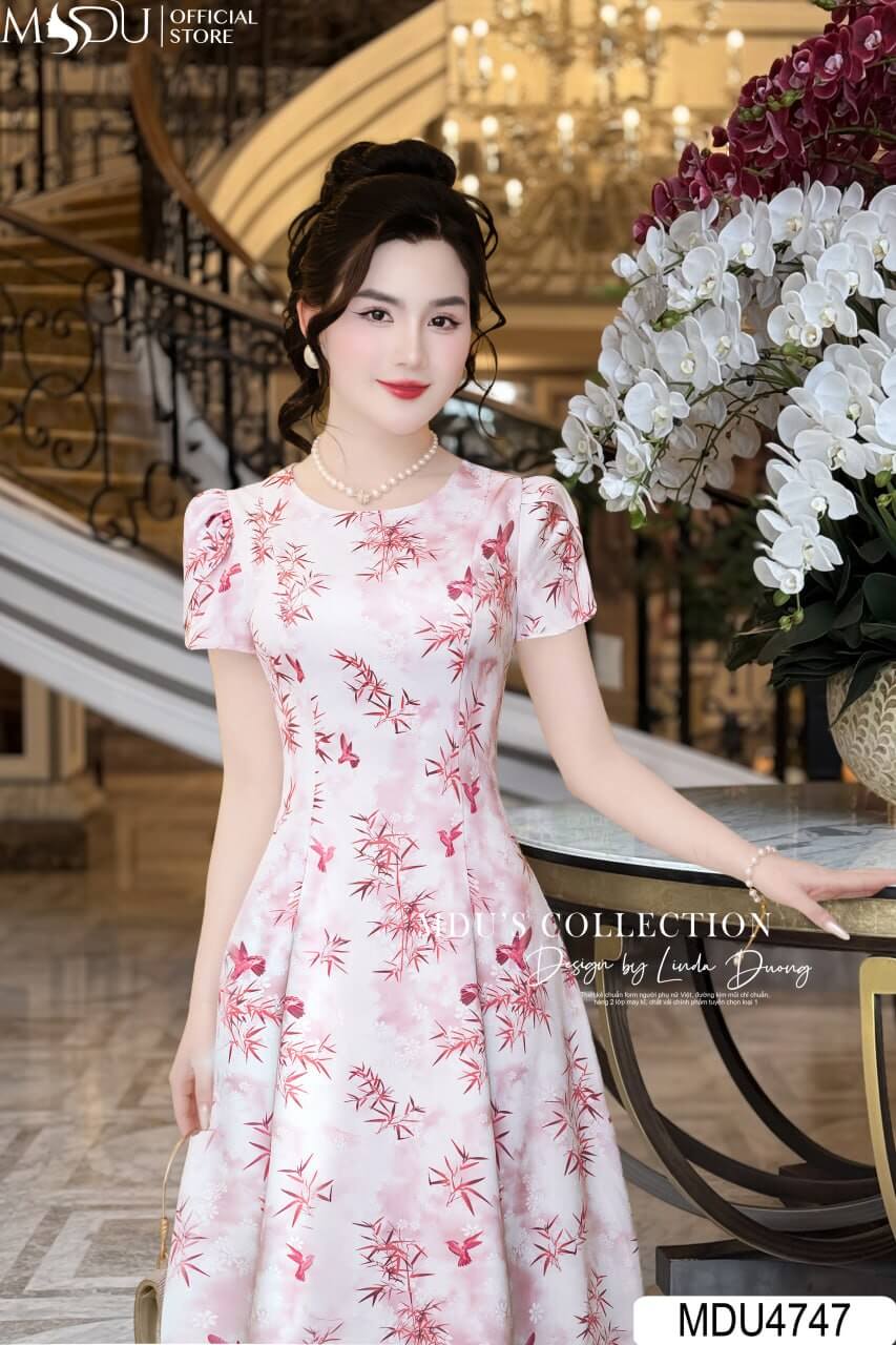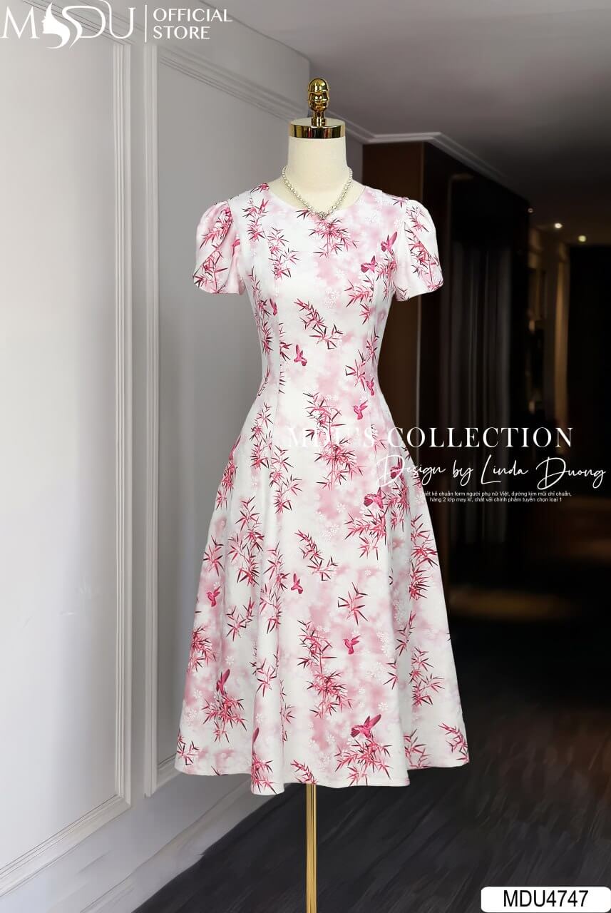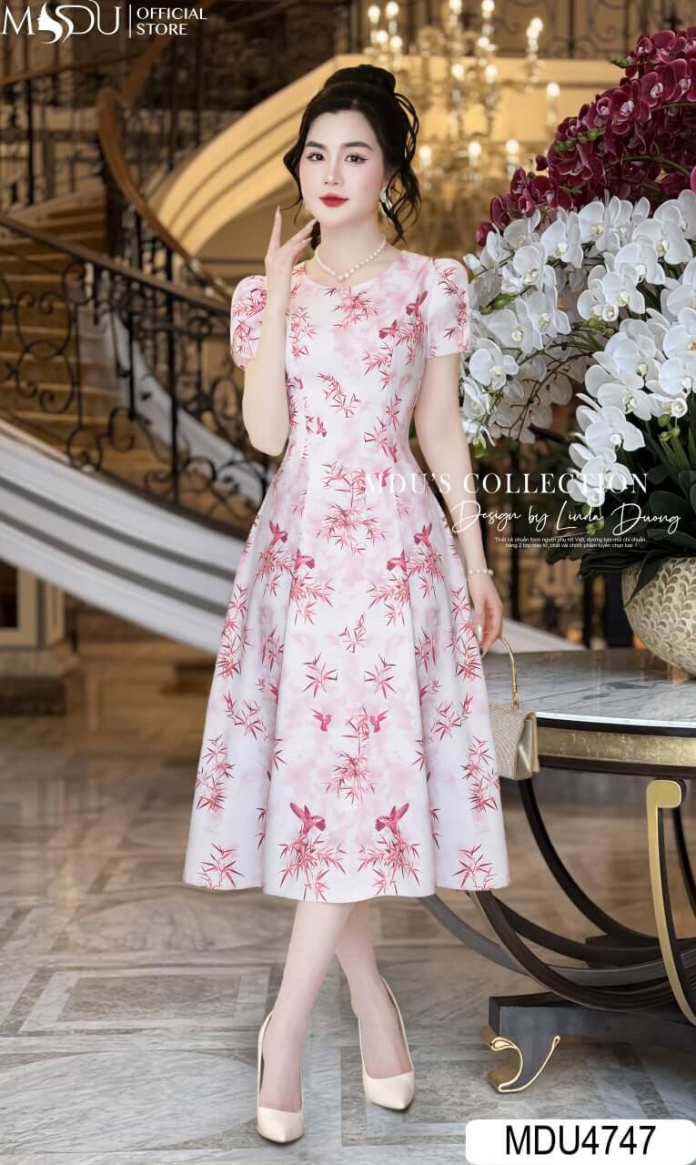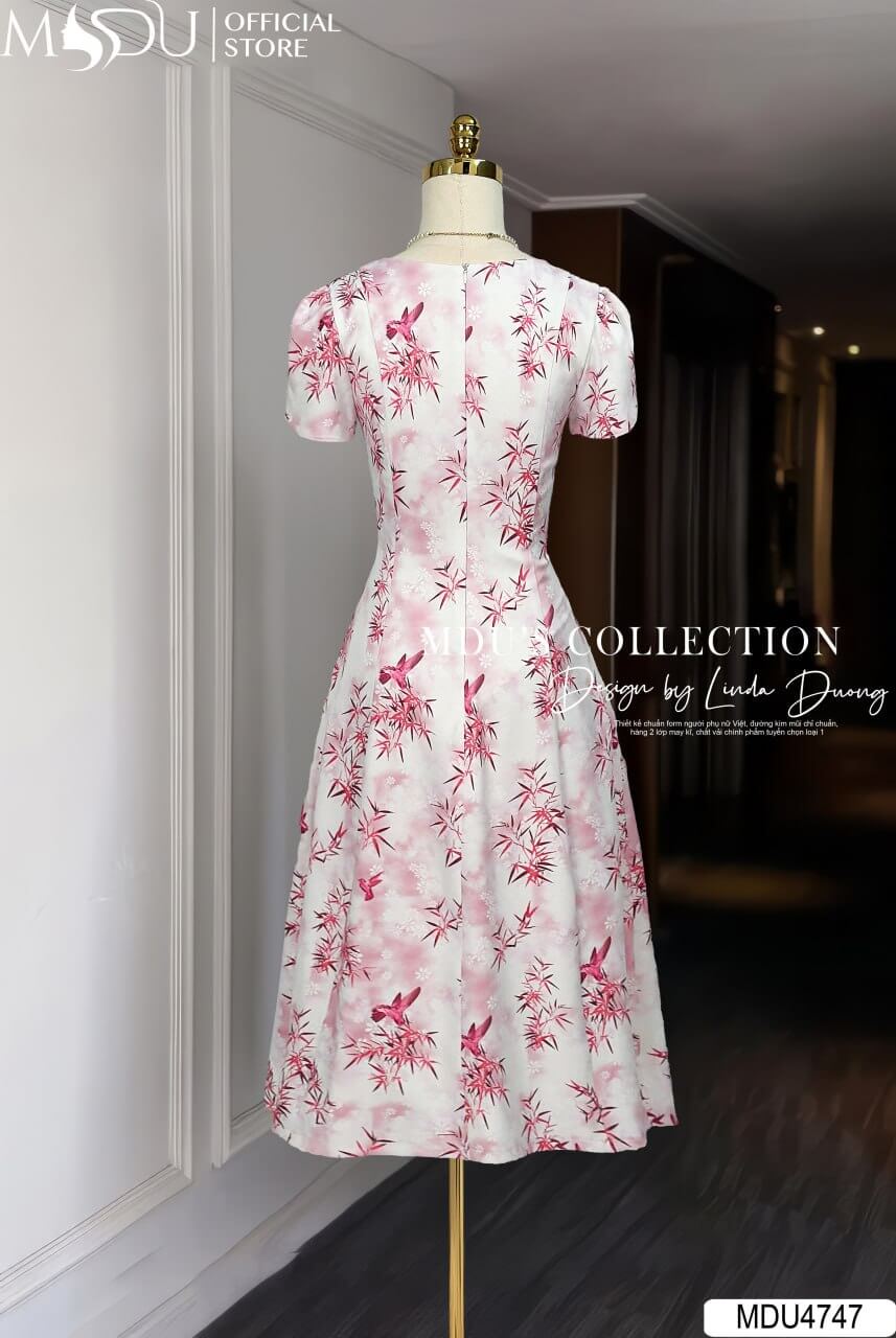 Váy MDU4747 sở hữu sắc trắng phớt hồng nhẹ nhàng, được điểm xuyết bởi họa tiết trúc đỏ và hình ảnh chim én bay lượn, gợi lên vẻ đẹp thuần khiết nhưng không kém phần nổi bật. Thiết kế cổ tròn thanh thoát kết hợp cùng tay bồng nhẹ nhàng mang đến nét nữ tính, dịu dàng, trong khi phần eo chiết khéo léo tôn lên vòng eo thon gọn, tạo nên đường nét hài hòa và cân đối cho vóc dáng.