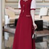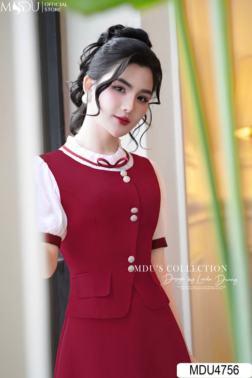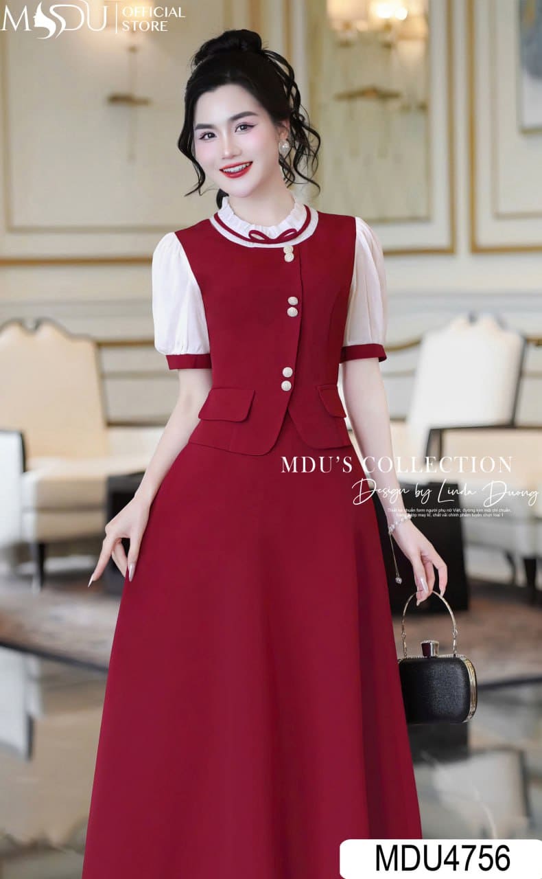 Set Thiết Kế MDU4756 Mango Ý Đỏ Đô Áo Vest Cách Điệu Khuy Ngọc & Váy Dài Xòe Bay Bổng