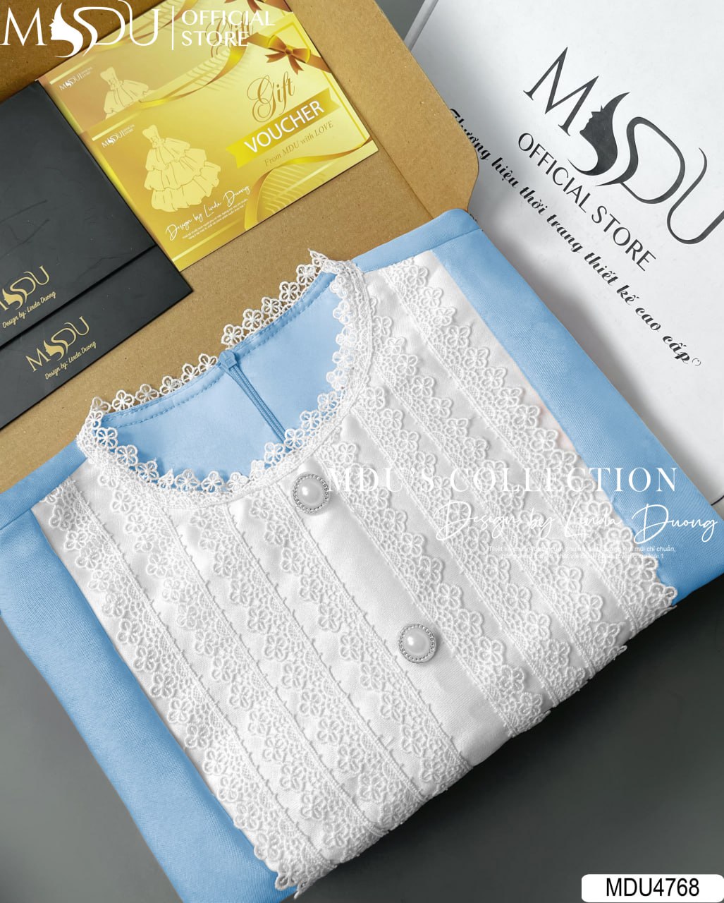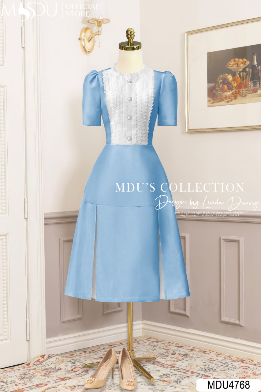 Điểm nhấn của MDU4768 nằm ở thiết kế tay bồng nhẹ nhàng kết hợp phần ngực phối ren độc đáo, được tô điểm bởi hàng cúc ngọc tinh tế. Sự giao thoa giữa chất liệu tafta bóng mượt và ren cao cấp tạo nên hiệu ứng vừa mềm mại, vừa sang trọng, tôn lên vẻ đẹp nữ tính mà không kém phần nổi bật.