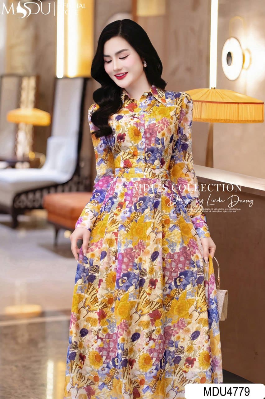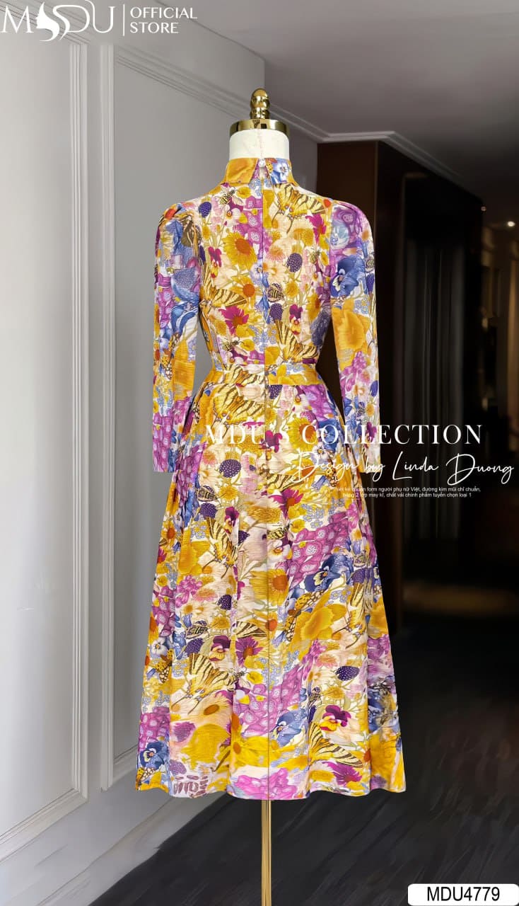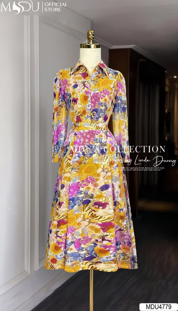 Váy Thiết Kế MDU4779 – Hoa Lá Rực Rỡ Cổ Sơ Mi Dáng Xòe Thanh Lịch