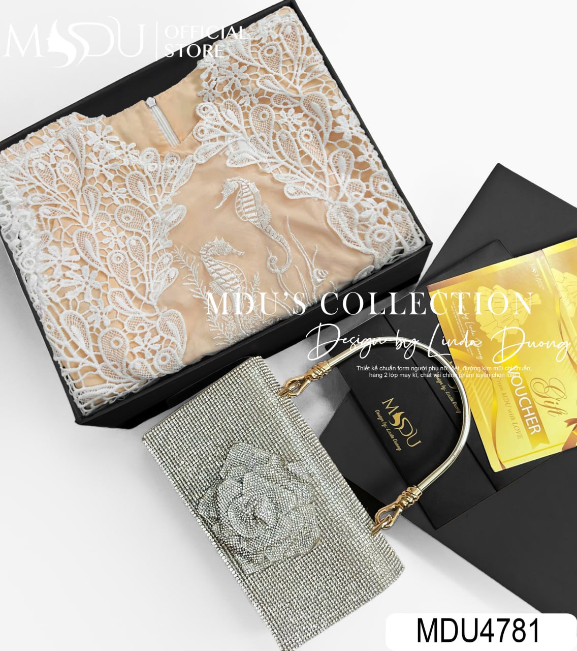 Gam màu kem dịu dàng trên nền ren điêu khắc cao cấp mang đến cảm giác tinh khôi, sang trọng nhưng vẫn đầy cuốn hút. Đai eo đính đá là chi tiết đắt giá, vừa tôn dáng vừa gợi nét thơ mộng, giúp nàng dễ dàng chinh phục mọi ánh nhìn. Thiết kế MDU4781 không chỉ định hình vóc dáng hoàn hảo mà còn tạo cảm giác nhẹ nhàng, bay bổng, phù hợp với những sự kiện cần sự nổi bật nhưng vẫn đậm chất thanh lịch.
