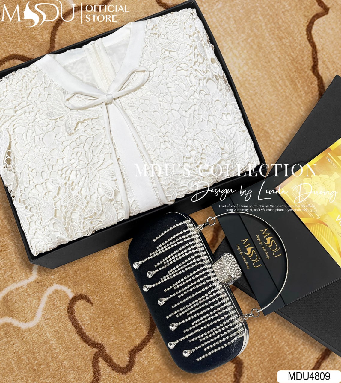 Gam màu trắng kem thanh lịch trên nền ren thêu điêu khắc cao cấp mang đến cảm giác tinh khôi, sang trọng nhưng vẫn đầy cuốn hút. Cổ nơ nhẹ nhàng là chi tiết đắt giá, vừa tôn dáng vừa gợi nét thơ mộng, giúp nàng dễ dàng thu hút mọi ánh nhìn. Thiết kế MDU4809 không chỉ định hình vóc dáng hoàn hảo mà còn tạo cảm giác nhẹ nhàng, thanh thoát, phù hợp với những sự kiện cần sự nổi bật nhưng vẫn giữ được vẻ thanh lịch.