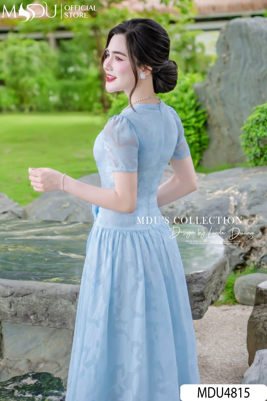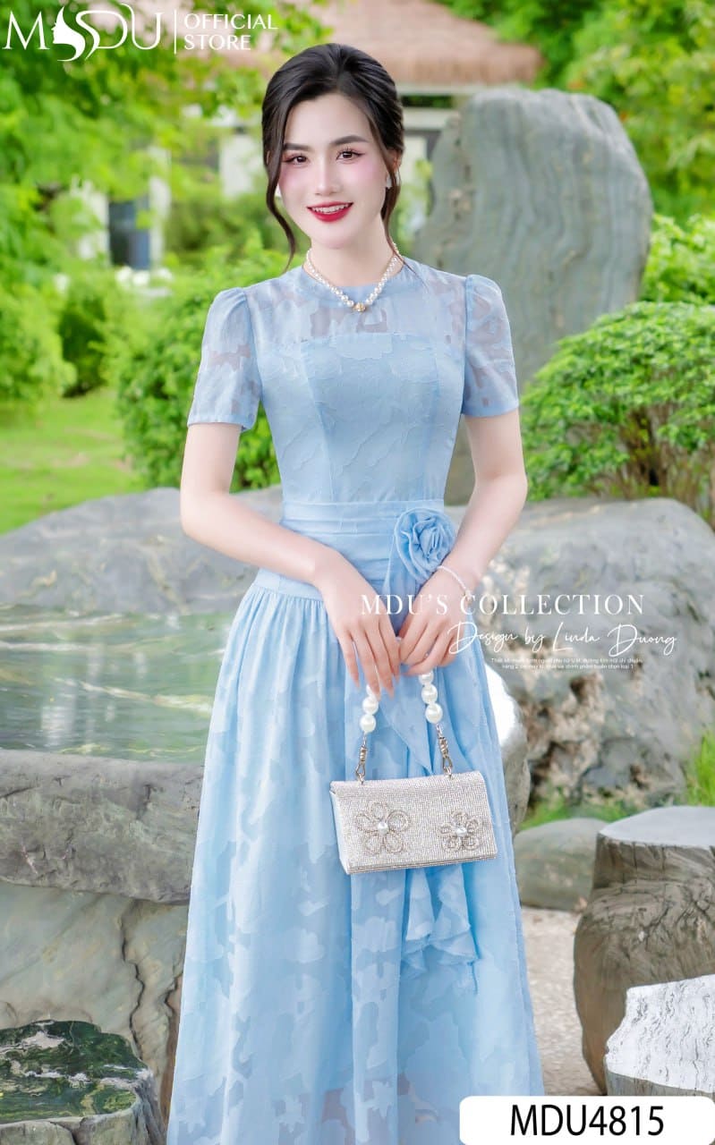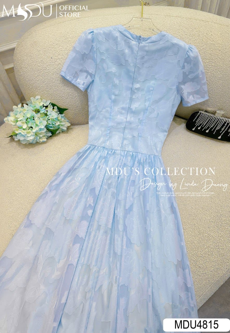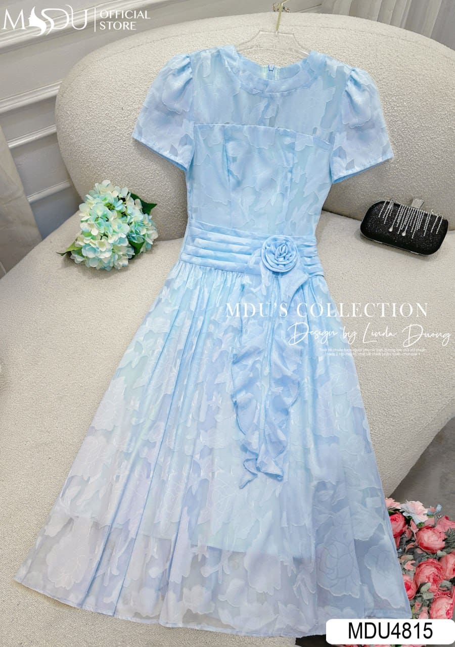 Váy Thiết Kế MDU4815 Tơ Ép Dập Nổi Dáng Xòe Nhẹ Hoa Đính Eo Bèo Buông Tay Xuyên Thấu