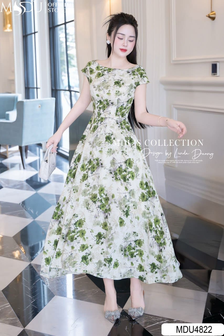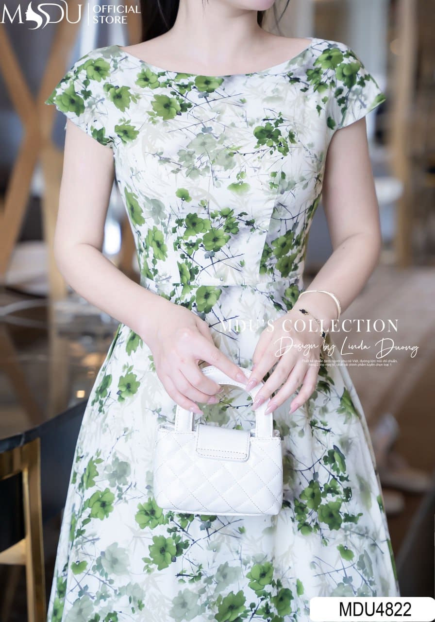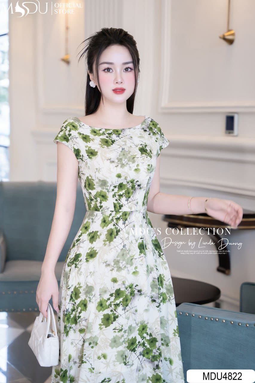 Váy Thiết Kế MDU4822 – Hoa Xanh Nền Kem, Cổ Thuyền Thanh Nhã Dịu Dàng