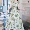 Thiết kế cổ thuyền thanh lịch giúp tôn lên phần cổ và xương quai xanh, khiến gương mặt thêm phần thanh tú và rạng rỡ. Tay váy che vừa đủ phần vai, mang đến cảm giác kín đáo, nhẹ nhàng và lịch sự. Dáng váy xòe dài mềm mại, kết hợp cùng họa tiết hoa xanh in trên nền trắng kem mang lại tổng thể trang nhã, thanh mát và đầy nữ tính – phù hợp để nàng diện đi làm, gặp khách hàng, hoặc tận hưởng những buổi cafe cuối tuần cùng bạn bè.