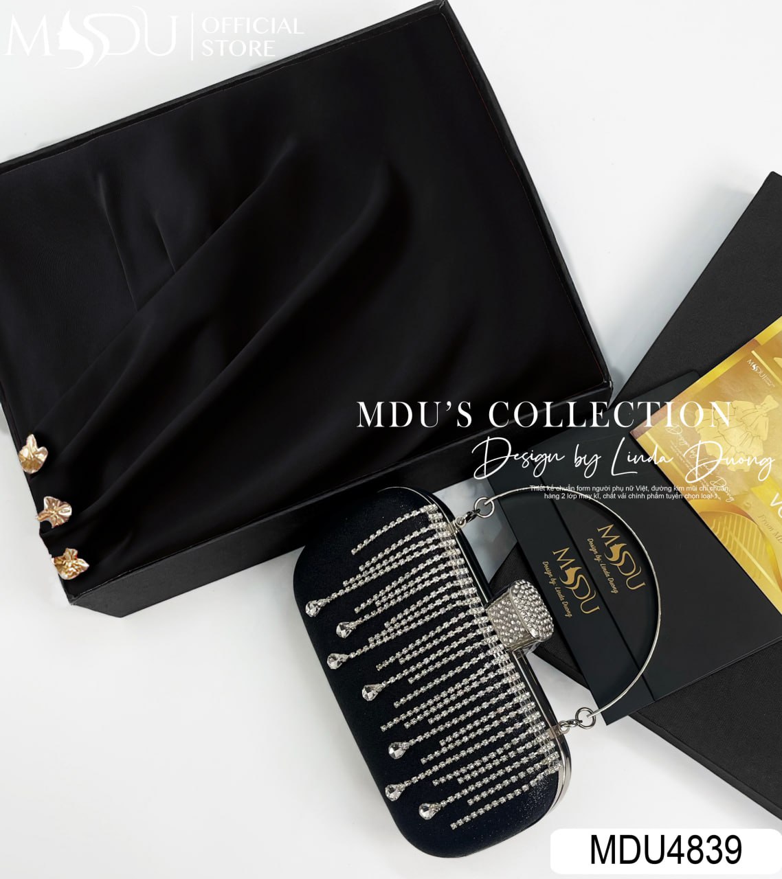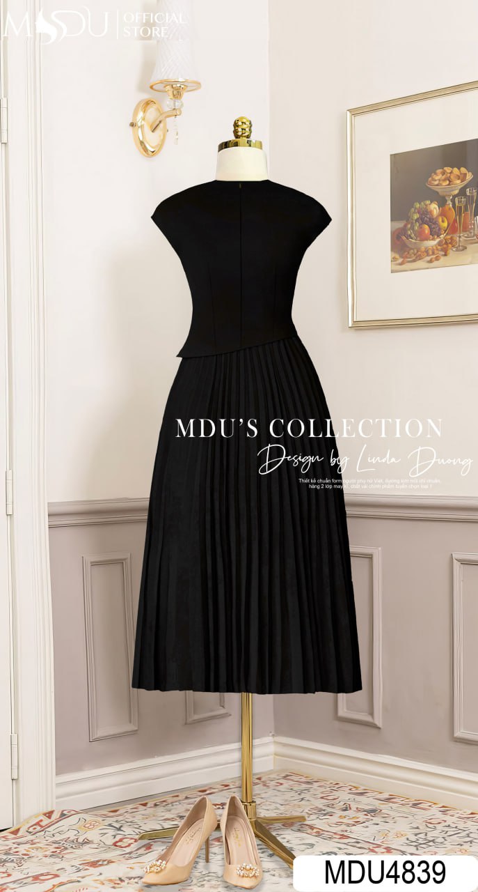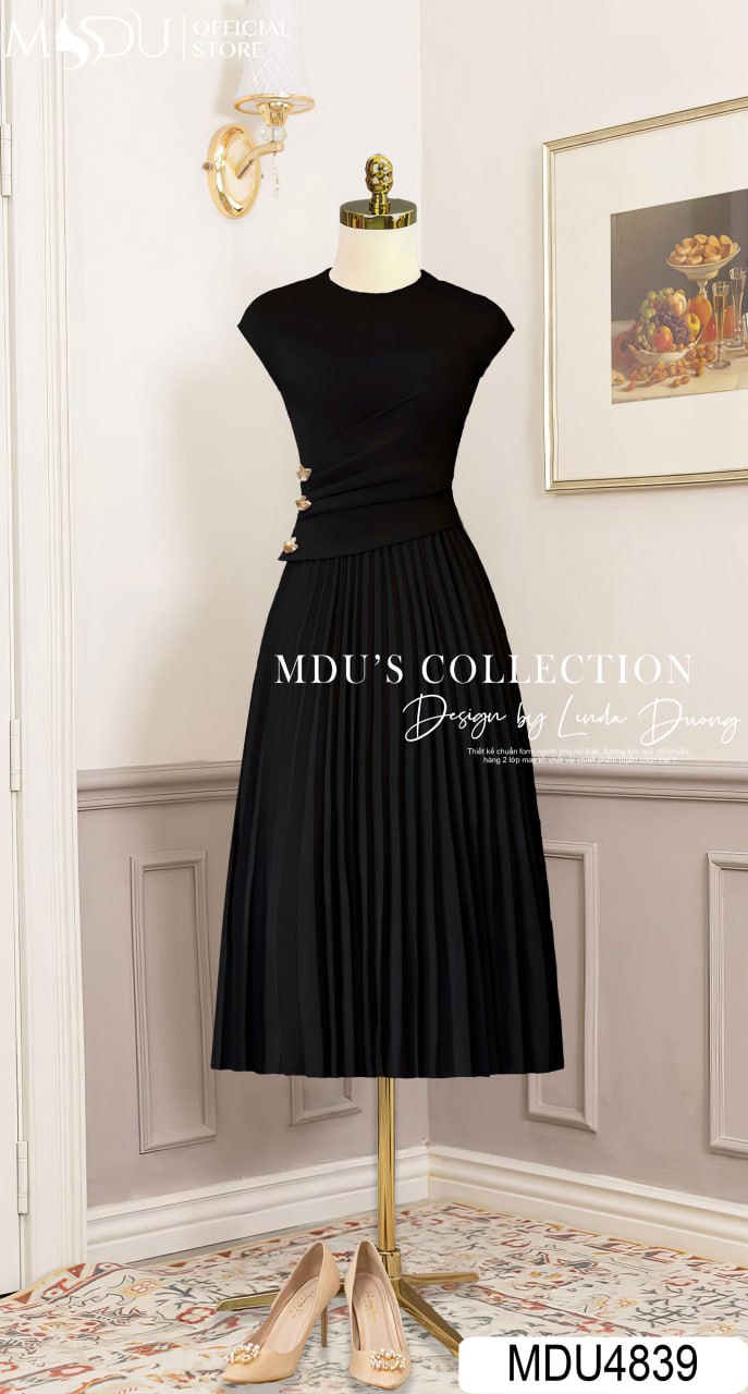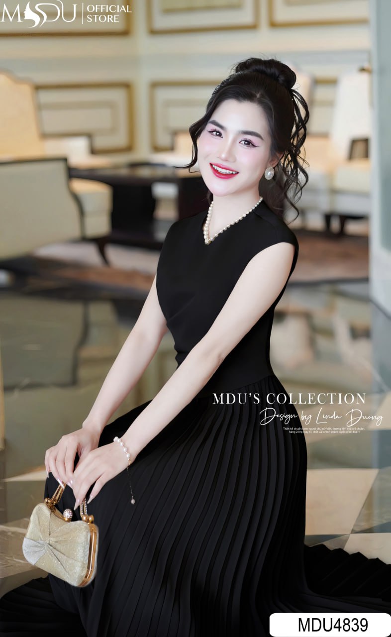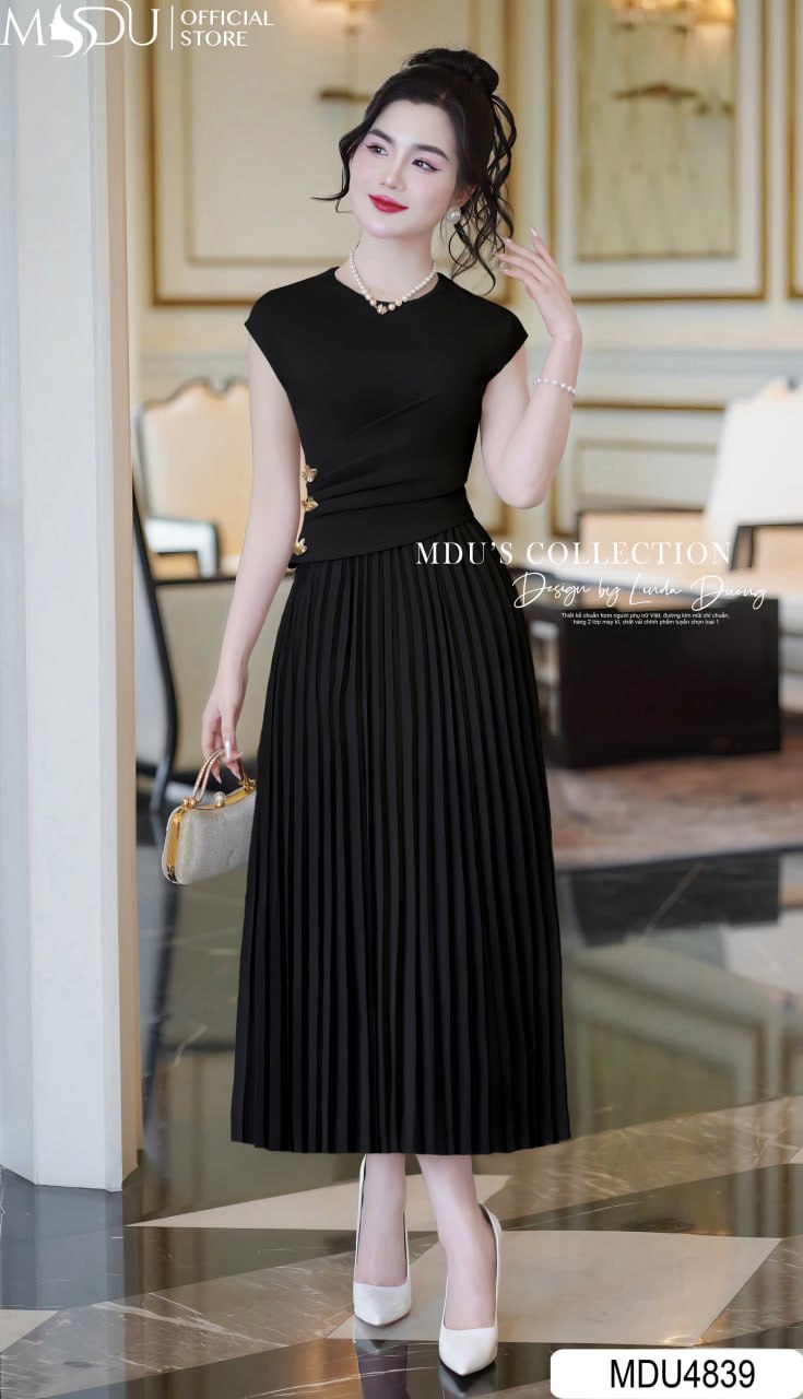 Phần eo được chiết khéo léo, điểm xuyết bởi hàng khuy ngọc ánh vàng sang trọng, tạo điểm nhấn kiêu kỳ, tôn lên vòng eo thon gọn và thần thái quý phái. Chân váy xếp ly bay nhẹ đầy cuốn hút, kết hợp cùng dáng tay sát nách thanh thoát, mang đến vẻ đẹp sang trọng nhưng không kém phần mềm mại. Thiết kế MDU4839 là sự hòa quyện hoàn hảo giữa nét hiện đại và thanh lịch, giúp nàng trở thành tâm điểm chú ý trong mọi sự kiện, tự tin tỏa sáng với phong cách nền nã và cuốn hút.