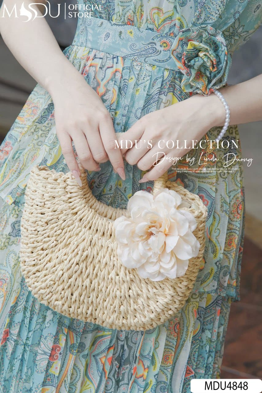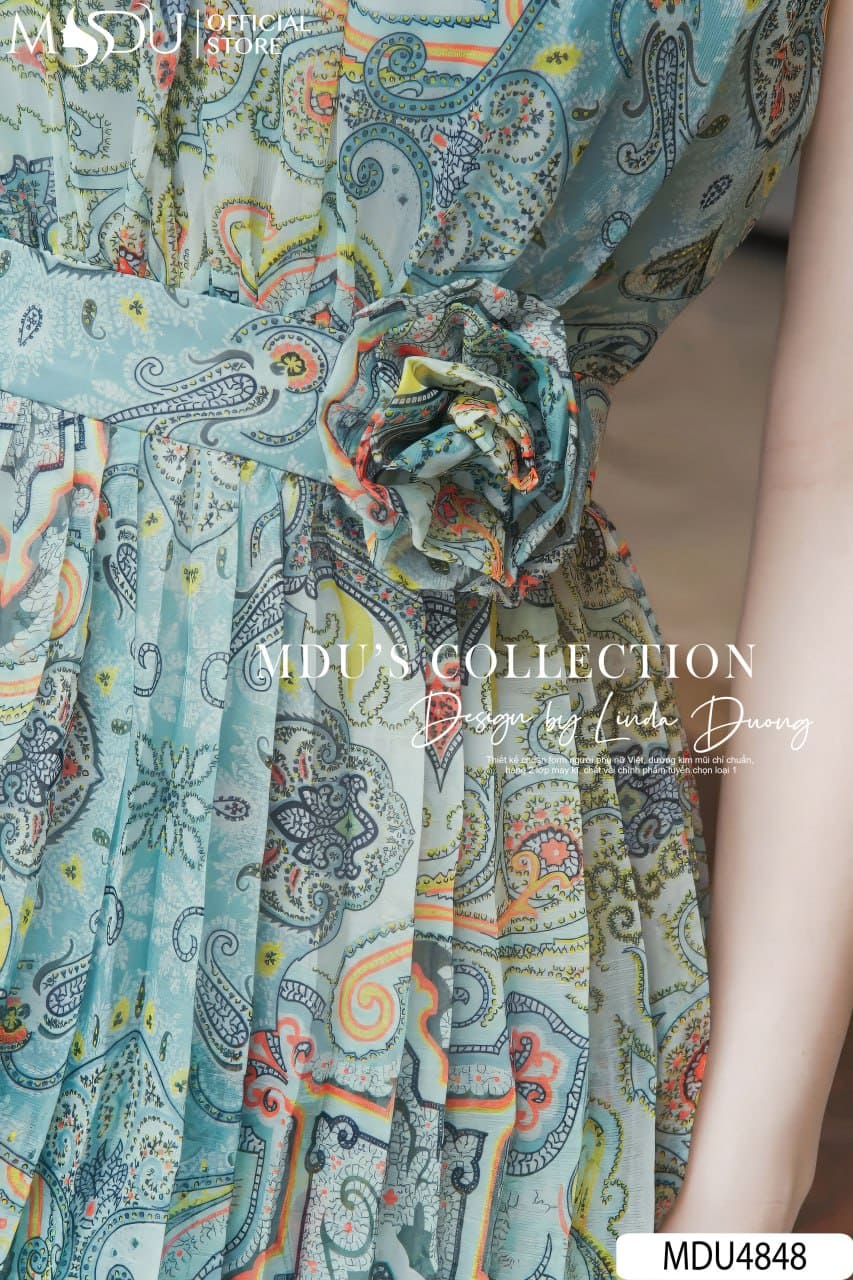 Váy MDU4848 được làm từ tơ xước cao cấp, mềm mịn, bắt sáng tự nhiên, tạo hiệu ứng thanh thoát và sang trọng. Họa tiết nổi bật trên nền vải xanh, kết hợp bông hoa 3D đính tại eo, tựa như một kiệt tác nghệ thuật, mang lại vẻ đẹp cuốn hút. Váy không co giãn, thiết kế 2 lớp với khóa giấu tinh tế và đường may tỉ mỉ, đảm bảo phom dáng hoàn hảo.