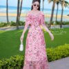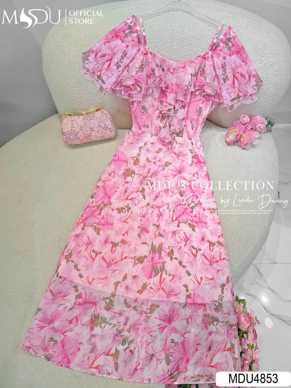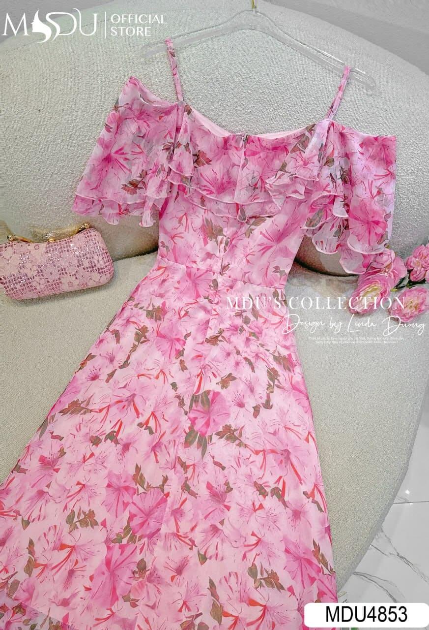 Phần trễ vai gợi cảm, phối cùng dây mảnh kép trẻ trung, khéo léo tôn lên bờ vai thanh mảnh và xương quai xanh quyến rũ.MDU4853 Dáng váy dài xòe nhẹ, giúp tạo sự uyển chuyển trong mỗi bước đi. Trên nền hồng ngọt ngào, họa tiết hoa rực rỡ bung nở như một bức tranh sống động mùa hạ. Đặc biệt, chi tiết tầng bèo trước ngực tạo độ bồng bềnh duyên dáng, mang đến vẻ đẹp thơ mộng và nhẹ nhàng, đúng chất nàng thơ hiện đại.