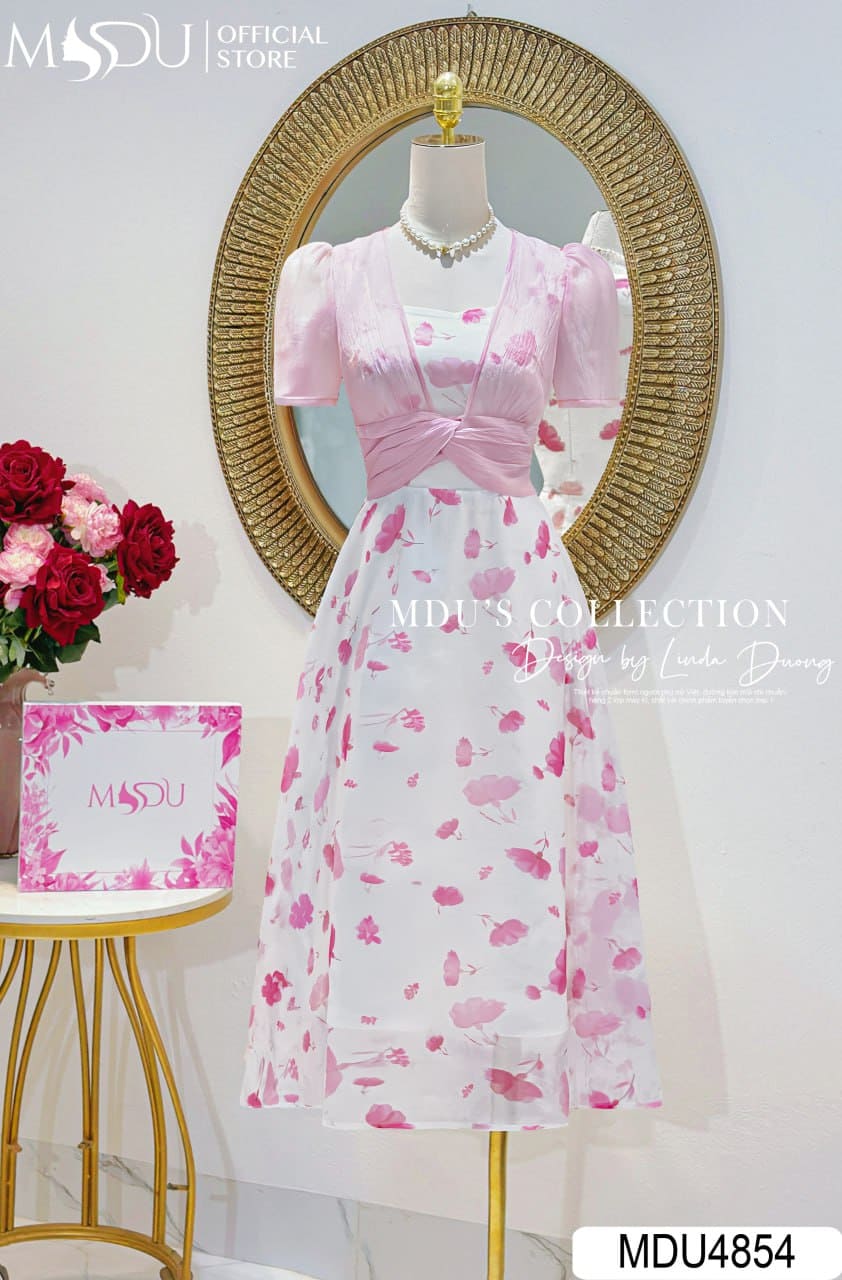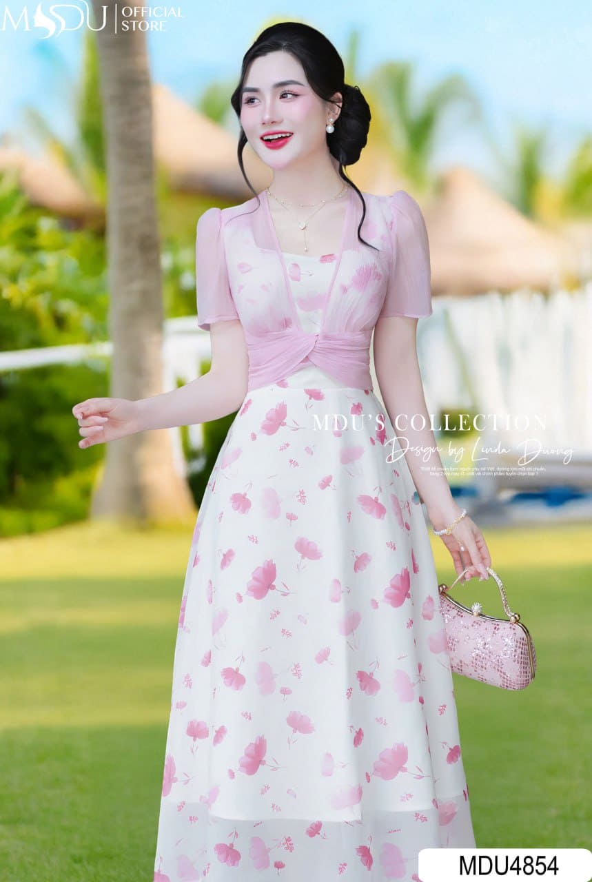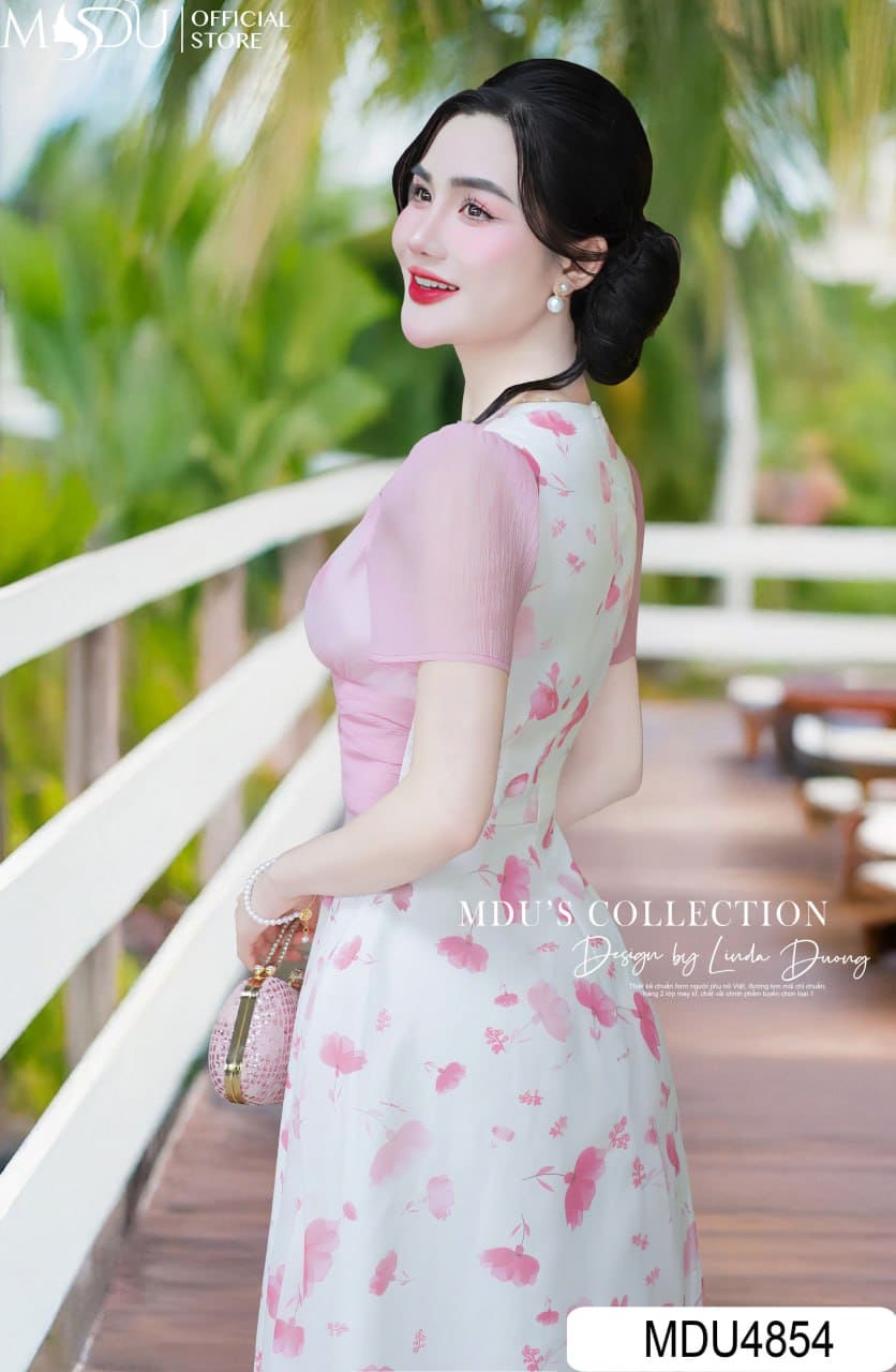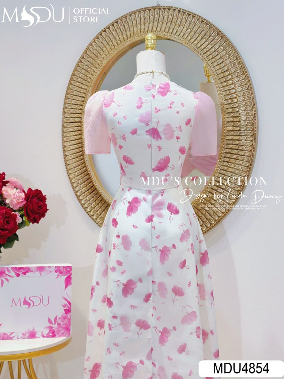 Váy dáng dài xòe nhẹ nhàng, ôm eo tôn dáng, kết nối tay bồng ngắn thanh lịch, tạo nên vẻ ngoài hiện đại và nữ tính. Điểm nhấn đặc biệt nằm ở chi tiết chéo thân trước như dải ruy băng mềm mại, mang lại hiệu ứng thị giác thon gọn và duyên dáng. MDU4854 là sự lựa chọn hoàn hảo cho các sự kiện đặc biệt, giúp bạn tỏa sáng với sự hoàn hảo thanh thoát và tinh khôi phục.