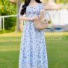 Chi tiết tay bồng phối nơ xinh xắn đính cố định trên ống tay, kết hợp cổ vuông phối cúc bọc và nẹp vải giao chéo tinh tế, giúp phần cổ trở nên mềm mại, tôn xương quai xanh một cách duyên dáng, vừa kín đáo vừa gợi cảm. Dáng váy xòe với chiết eo cao khéo léo tôn dáng, làm nổi bật vòng eo một cách nhẹ nhàng, mang lại sự uyển chuyển và thanh thoát.