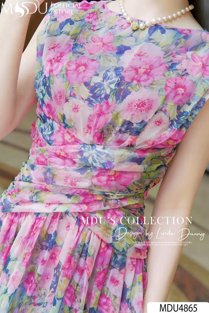 Váy MDU4865 sử dụng chất liệu tơ xước cao cấp, nổi bật với độ mỏng nhẹ, mềm mại, tạo cảm giác thoáng mát và dễ chịu khi mặc. Chất vải không co giãn, được hoàn thiện với khóa kéo giấu kín và đường may cẩn thận, đảm bảo sự chỉn chu và bền đẹp. Họa tiết hoa hồng xen tím và lá trên nền tơ gợi hình ảnh một khu vườn mùa xuân rộn ràng, mang đến tổng thể rực rỡ nhưng vẫn hài hòa và tinh tế.