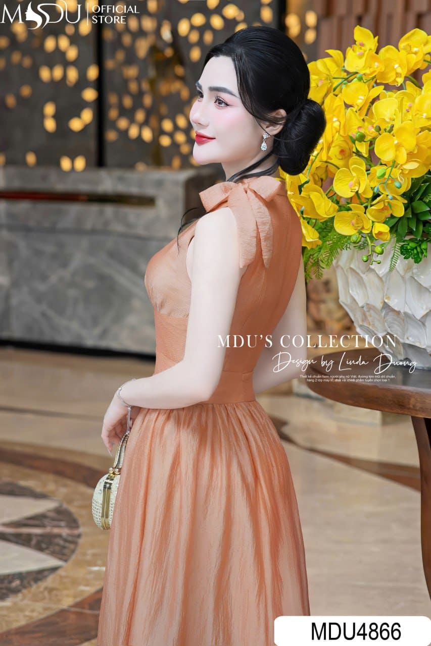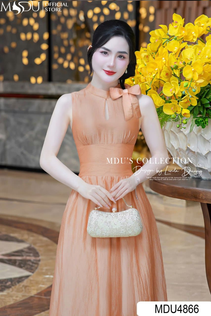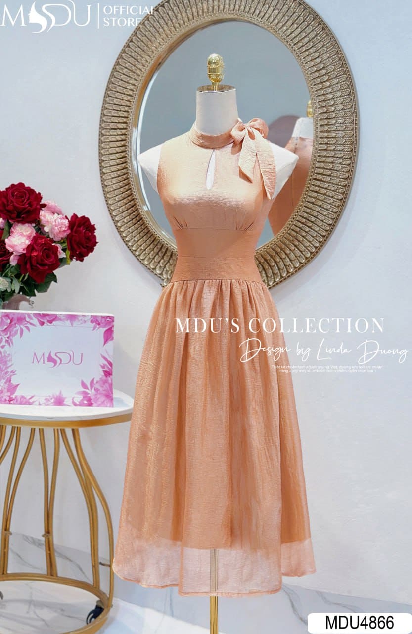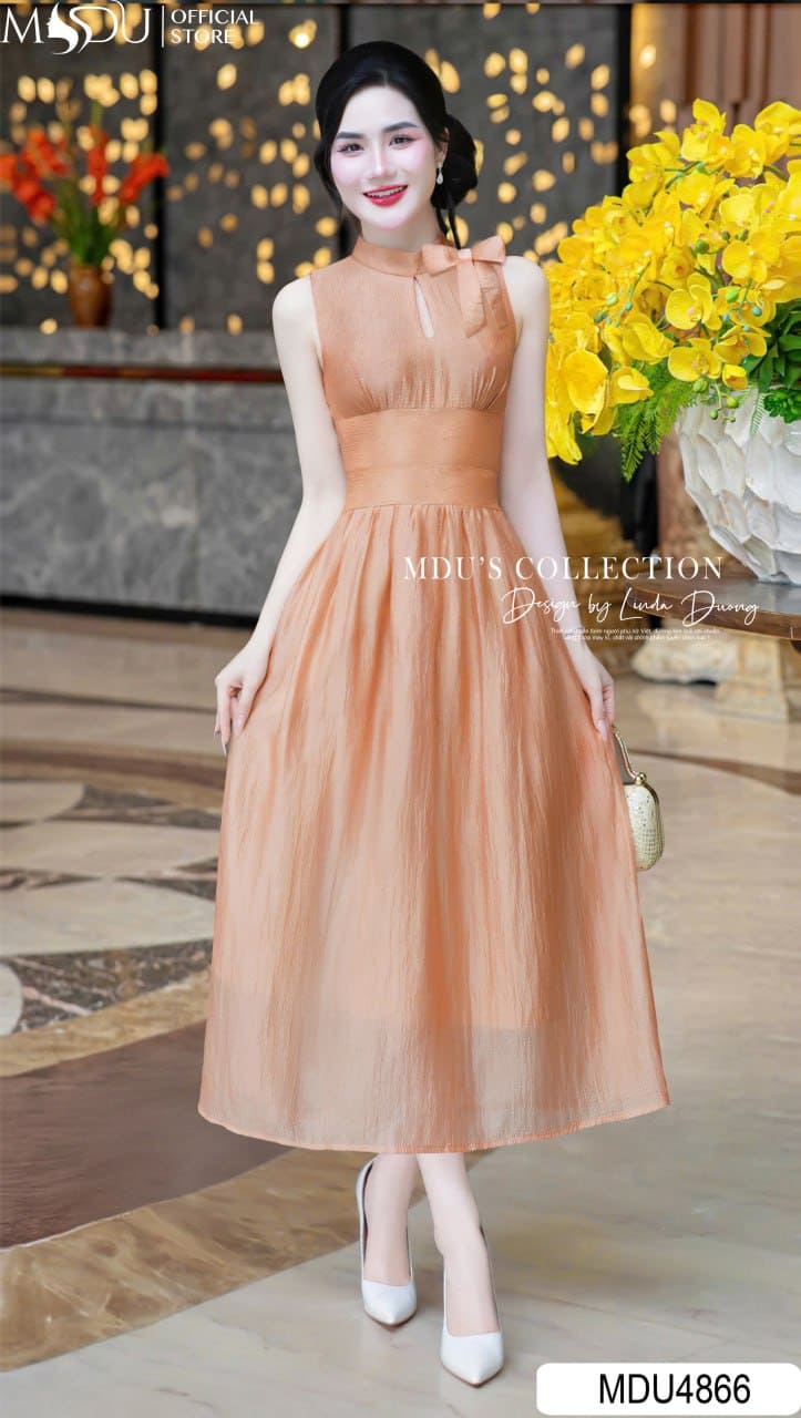 Váy Thiết Kế MDU4866 – Cam Đào Tơ Bọt, Giọt Lệ Duyên Dáng Và Nơ Cổ Tinh Tế