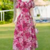 Váy được làm từ tơ xước cao cấp, mềm mịn, thoáng mát, mang lại cảm giác dễ chịu khi mặc. Họa tiết hoa mẫu đơn hồng đỏ trên nền hồng phấn, tựa như khu vườn mùa hè rực rỡ, tạo vẻ đẹp thơ mộng. Chất vải không co giãn, được may với khóa kéo và đường may giấu kín tỉ mỉ, đảm bảo phom dáng chuẩn.