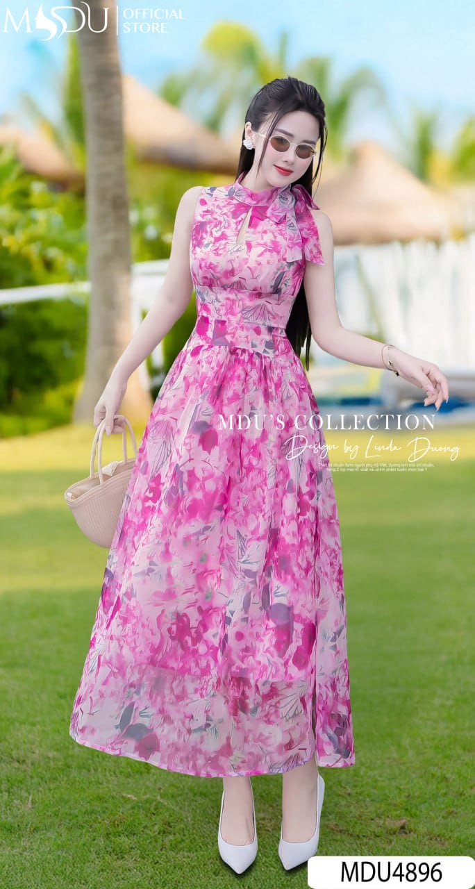 Thiết kế cổ yếm cách điệu với phần yếm cao ôm nhẹ cổ, chi tiết khoét giọt nước vừa phải cùng nơ lệch vai tinh tế tạo nên điểm nhấn gợi cảm nhưng vẫn giữ được nét kín đáo. Dáng váy xòe nhẹ phối cùng chiết eo khéo léo, giúp tôn dáng và tạo hiệu ứng đồng hồ cát mềm mại. Họa tiết hoa hồng loang sắc trải đều trên nền vải, mang lại vẻ rực rỡ mà không phô trương – vừa đủ nổi bật trong môi trường công sở, vừa lý tưởng cho những buổi dạo phố hay du lịch nhẹ nhàng.