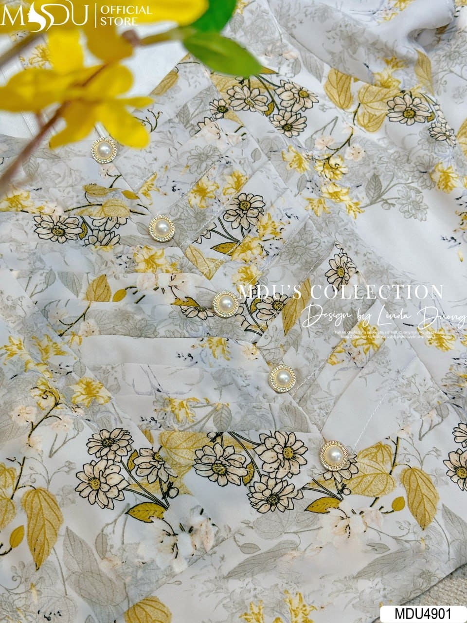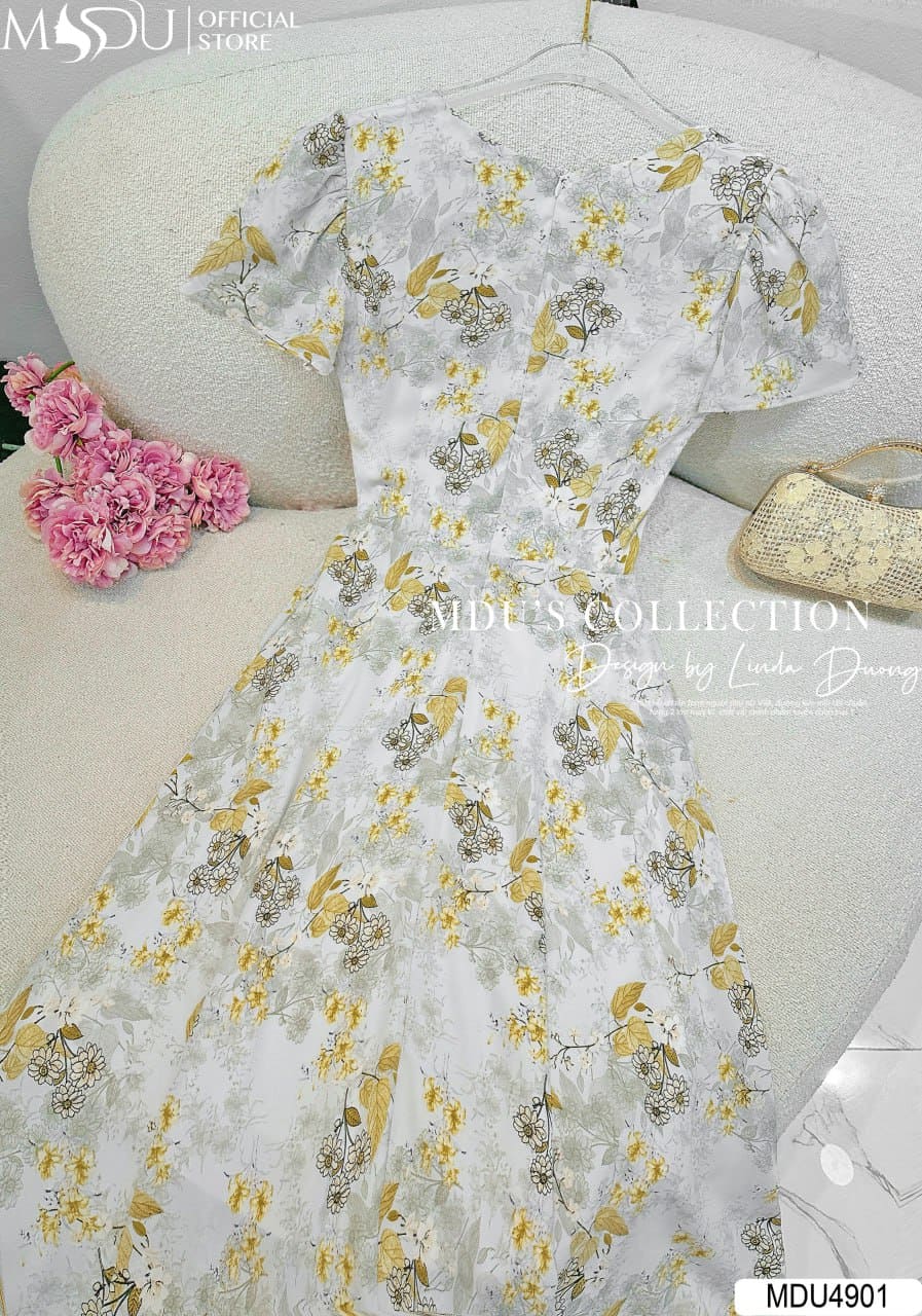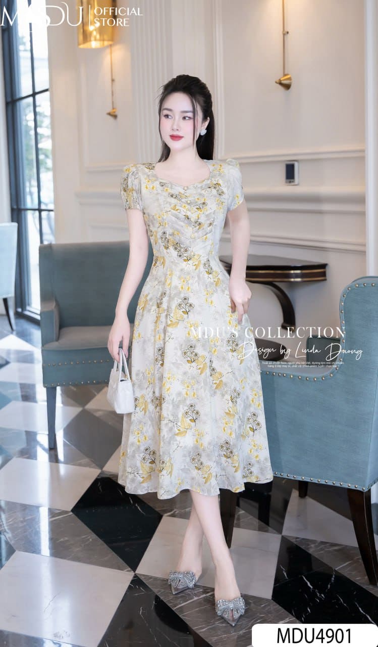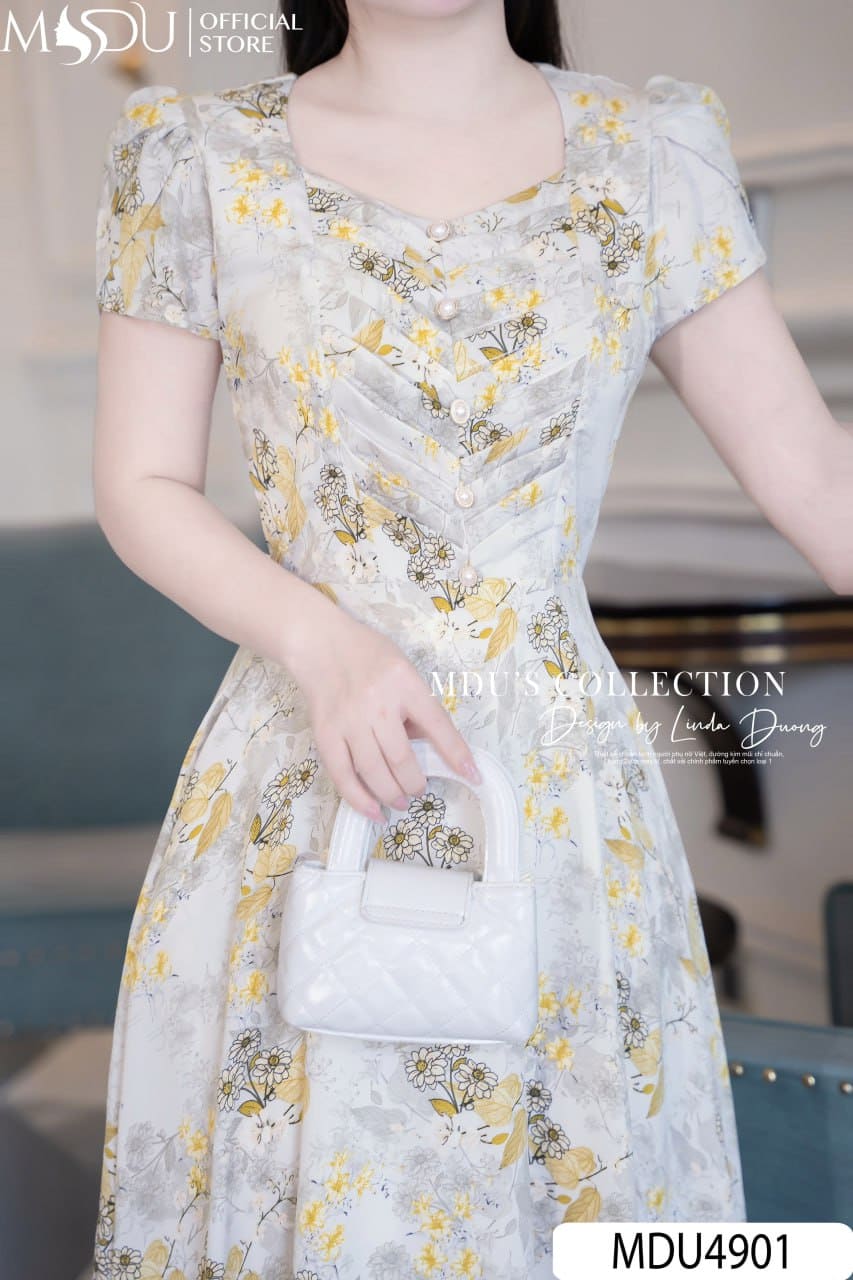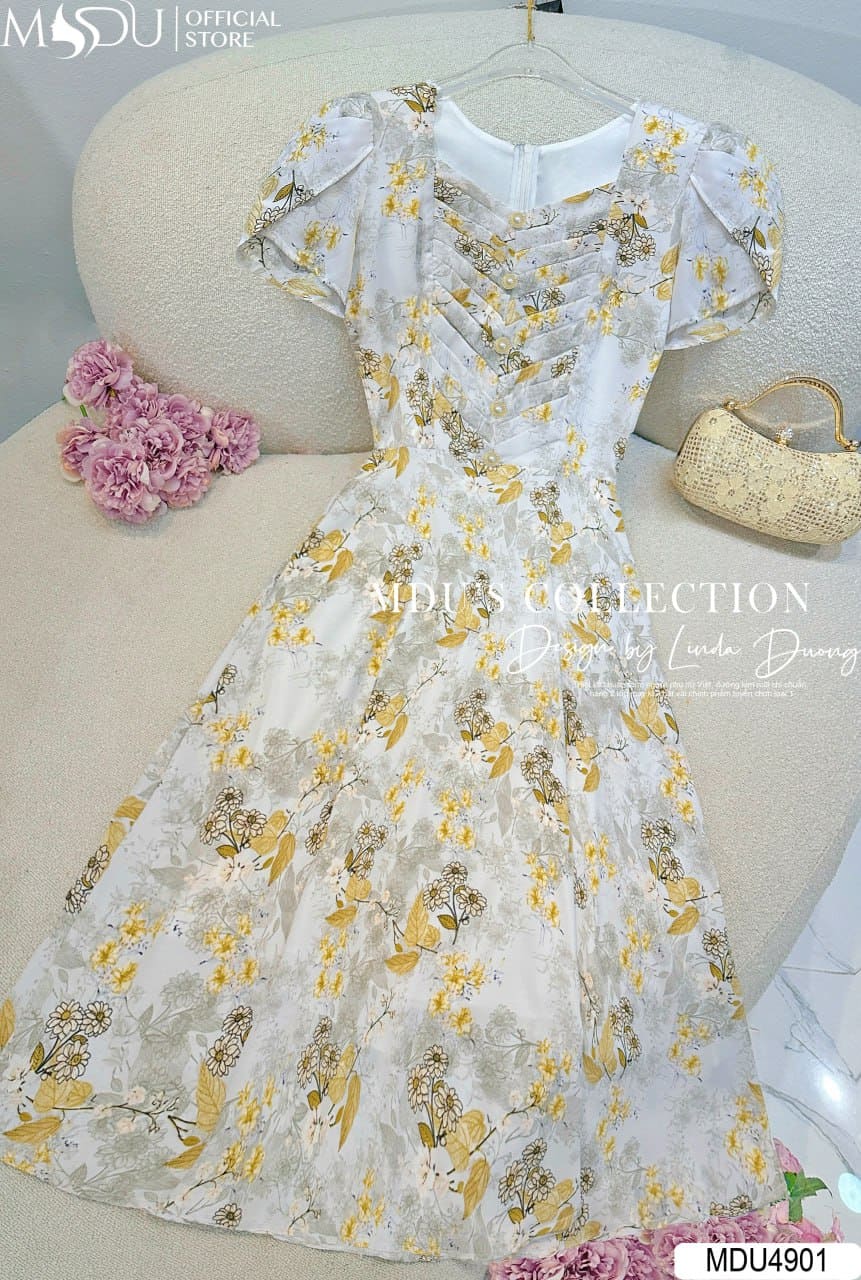 Váy Thiết Kế MDU4901 – Cổ Vuông Cúc Ngọc, Hoa Nhuyễn Bay Bổng Và Tinh Xảo