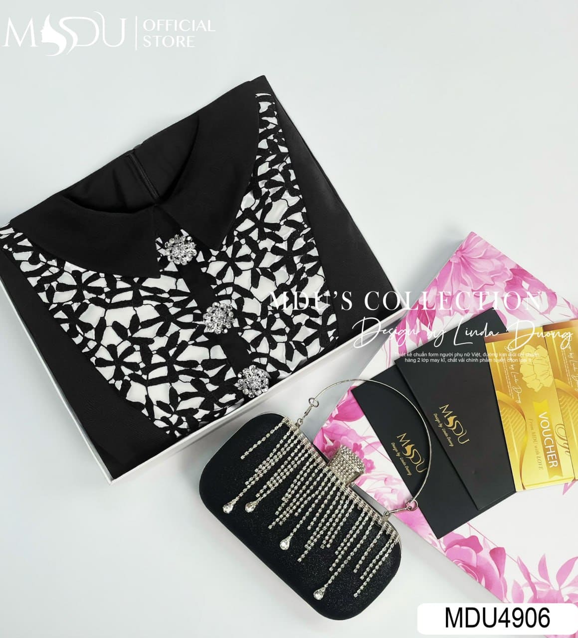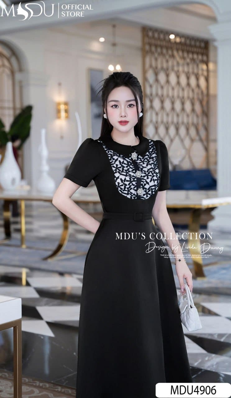 MDU Fashion giới thiệu MDU4906 – thiết kế váy đen thanh lịch với chất liệu Chéo Hàn phối Ren cao cấp, mang đến diện mạo vừa nền nã, hiện đại, vừa có chiều sâu. Phần ren thêu tỉ mỉ trước ngực, đá cài tháo rời và cổ sen cổ điển hòa quyện cùng tay ngắn gọn gàng, tạo nên một tổng thể cân bằng giữa năng động và tinh tế. Dáng váy xòe dài cùng chất liệu đứng phom giúp quý cô tỏa sáng ở nơi công sở hay trong những dịp gặp gỡ đặc biệt.