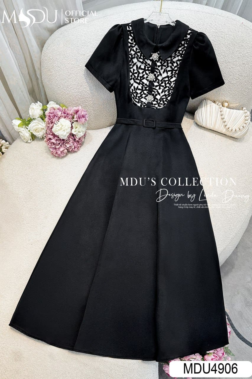 Váy Thiết Kế MDU4906 – Đen Thanh Lịch, Đính Ren Tinh Tế, Dáng Xòe Dài Nữ Tính