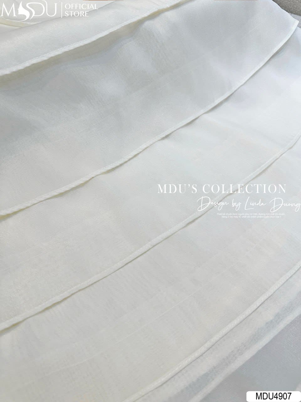 Điểm nhấn nổi bật của MDU4907 nằm ở nơ đá đính liền sang trọng, kết hợp cùng chi tiết xẻ khoét nhẹ nơi ngực, tạo hiệu ứng thị giác tinh tế và đầy cuốn hút mà vẫn giữ nét thanh lịch. Cổ tròn nhẹ nhàng phối cùng tay ngắn giúp tổng thể trở nên cân đối và hài hòa. Dáng váy xòe chia tầng mềm mại, tăng độ bồng bềnh trong từng bước chuyển động – mang lại hình ảnh nàng thơ hiện đại vừa quyến rũ, vừa thanh tao.