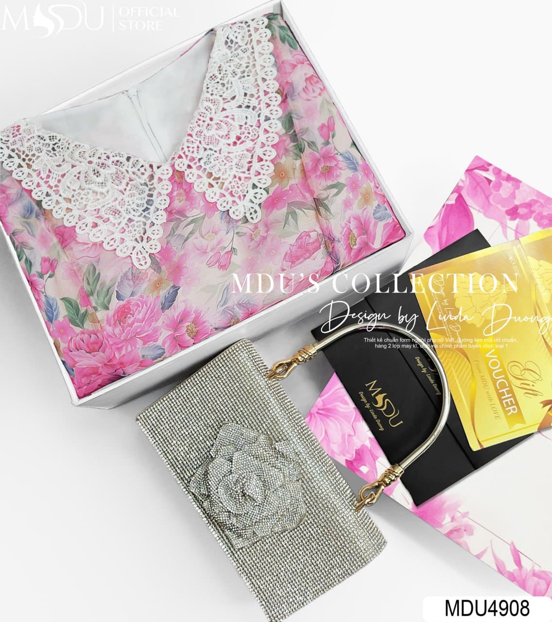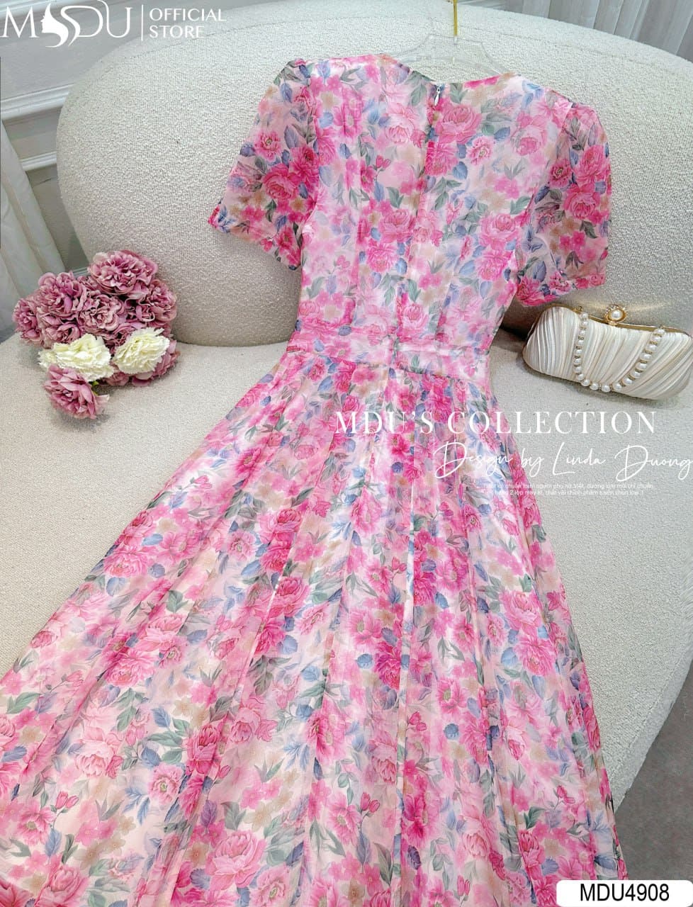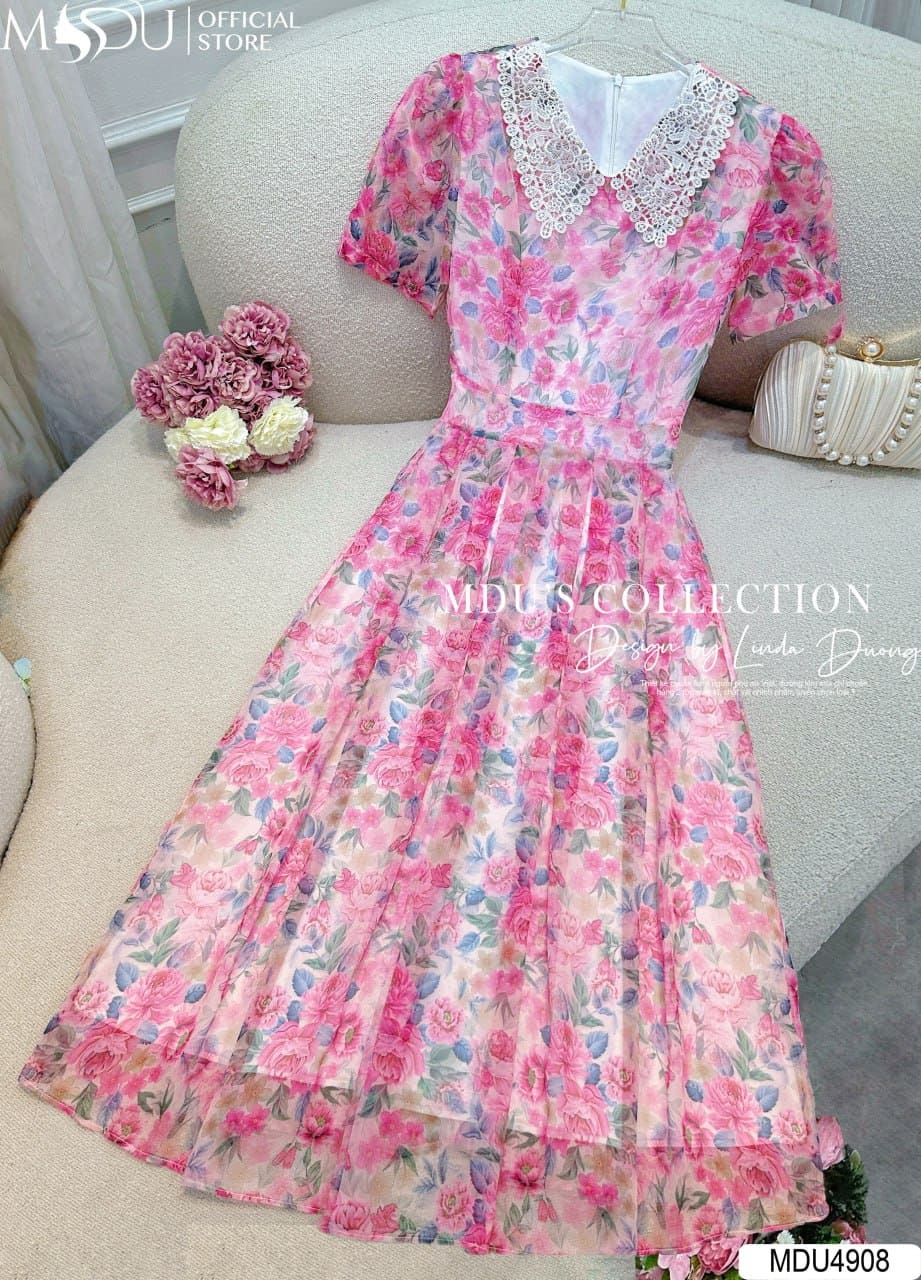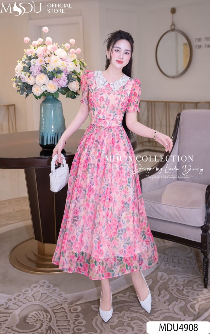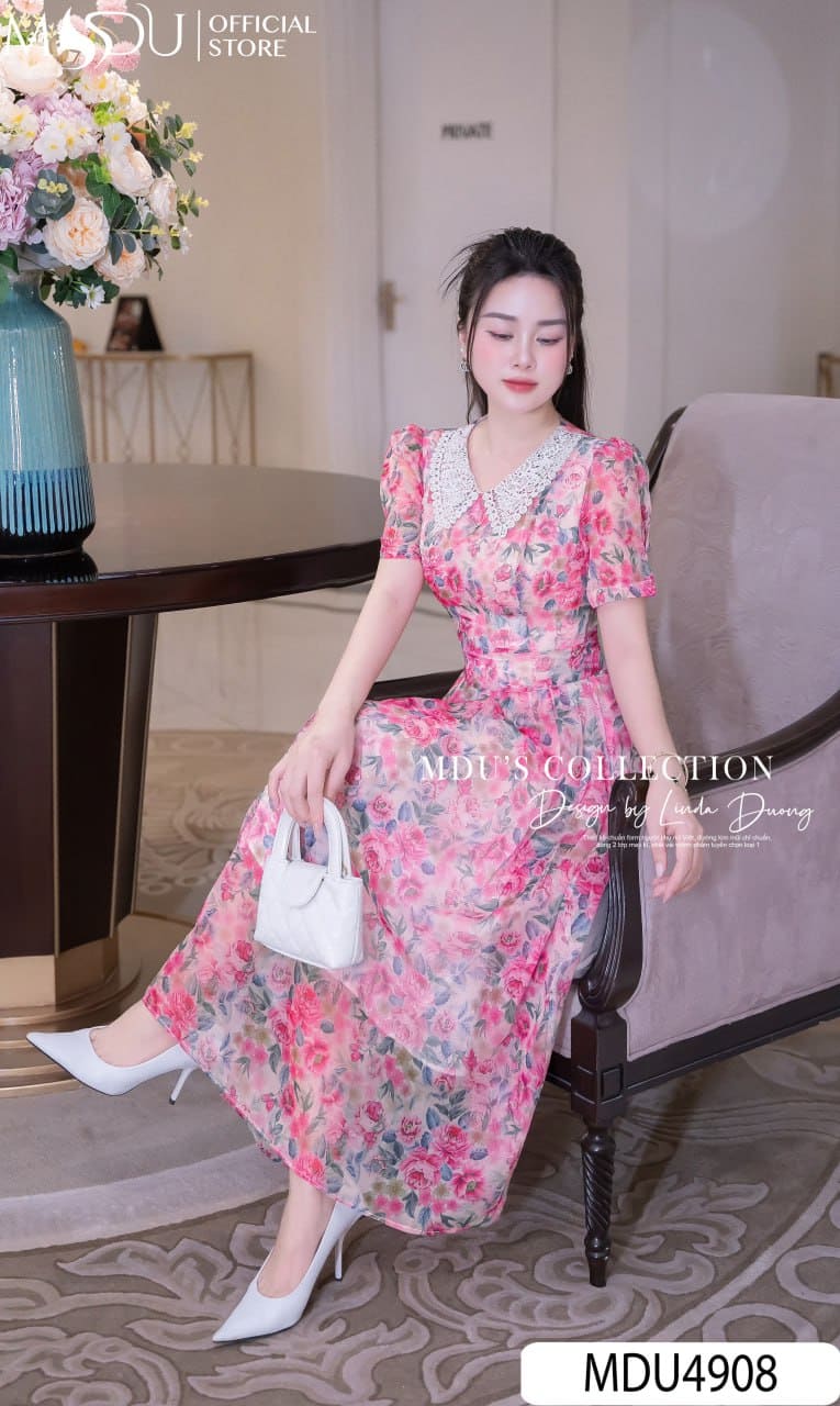 MDU Fashion giới thiệu MDU4908 – thiết kế đậm chất nữ tính với chất tơ xước phối ren hoa ngọt ngào, được lót bên trong bằng lụa Habutai mềm mại, tạo nên tổng thể bay bổng và thanh lịch. Phần cổ ren trắng mang hơi thở cổ điển, kết hợp cùng tay bồng nhẹ và thân váy xếp ly mềm mại tạo nên vẻ đẹp vừa trong trẻo vừa cuốn hút. Phom dáng dài xòe nhẹ, chiết eo cao giúp tôn trọn đường cong và nét uyển chuyển tự nhiên của nàng.