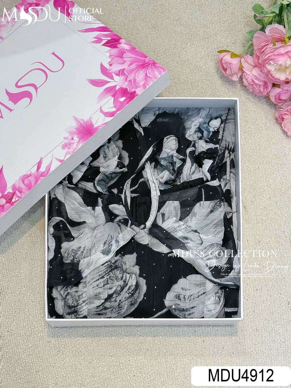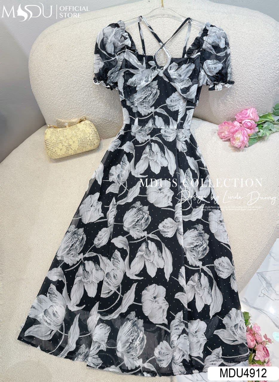 Thiết kế trễ vai quyến rũ phối tay bo chun nhẹ tạo độ phồng tự nhiên, mang lại sự nữ tính và thoải mái. Phần dây buộc cổ cách điệu giúp định hình cổ áo mềm mại, đồng thời tôn lên xương quai xanh và cổ thanh tú. Họa tiết hoa trắng nổi bật trên nền đen, mang đến vẻ đẹp cuốn hút, hài hòa giữa cổ điển và hiện đại – lý tưởng cho những buổi tiệc nhẹ, buổi hẹn hò hoặc khoảnh khắc nàng muốn tỏa sáng một cách lặng lẽ.
