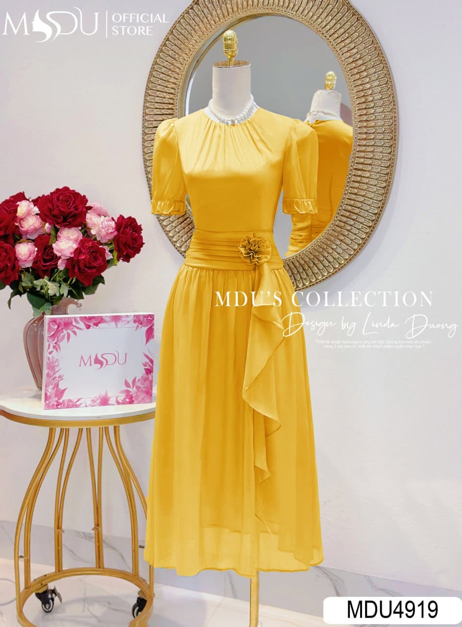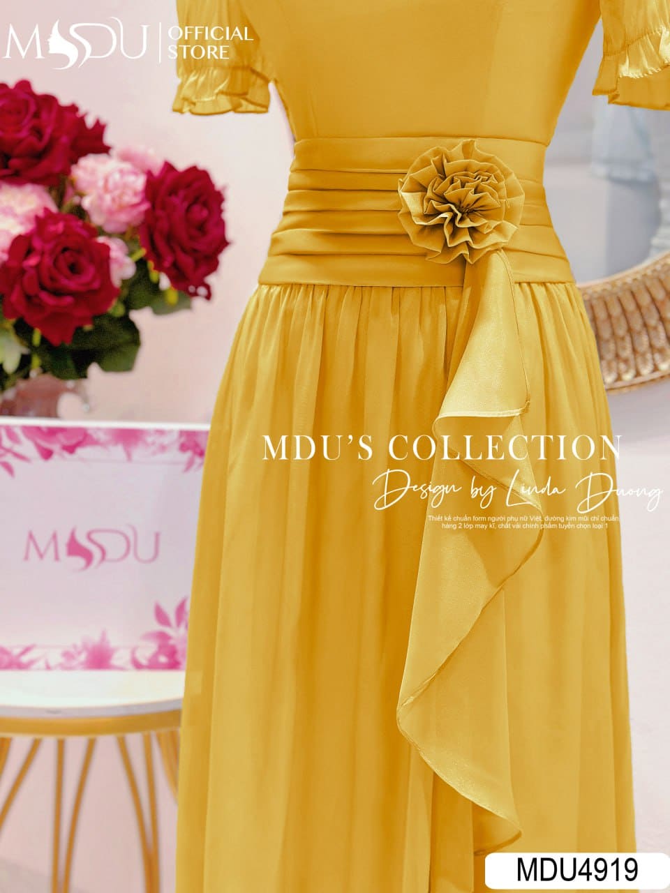 Váy Thiết Kế MDU4919 – Vàng Rực Rỡ Hoa 3D, Thanh Thoát Và Kiêu Kỳ
