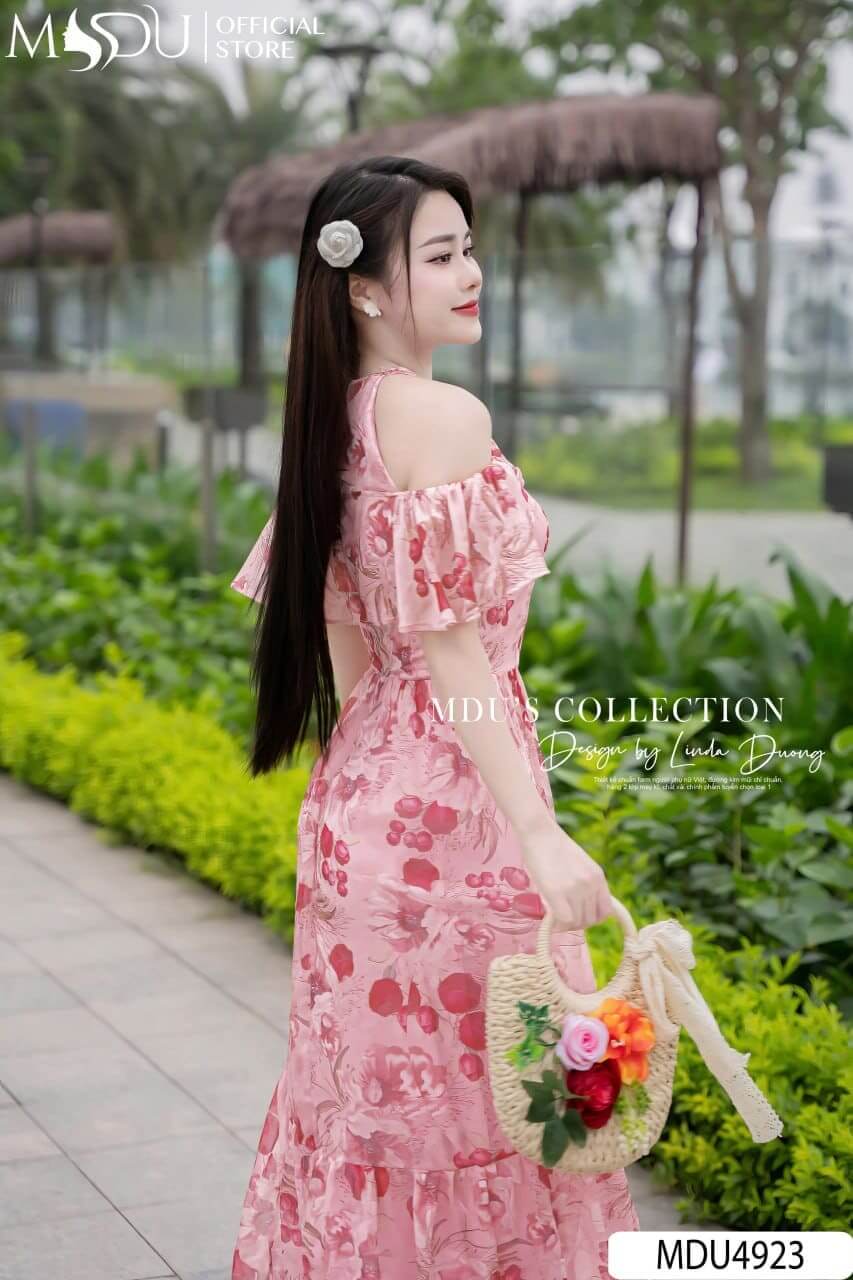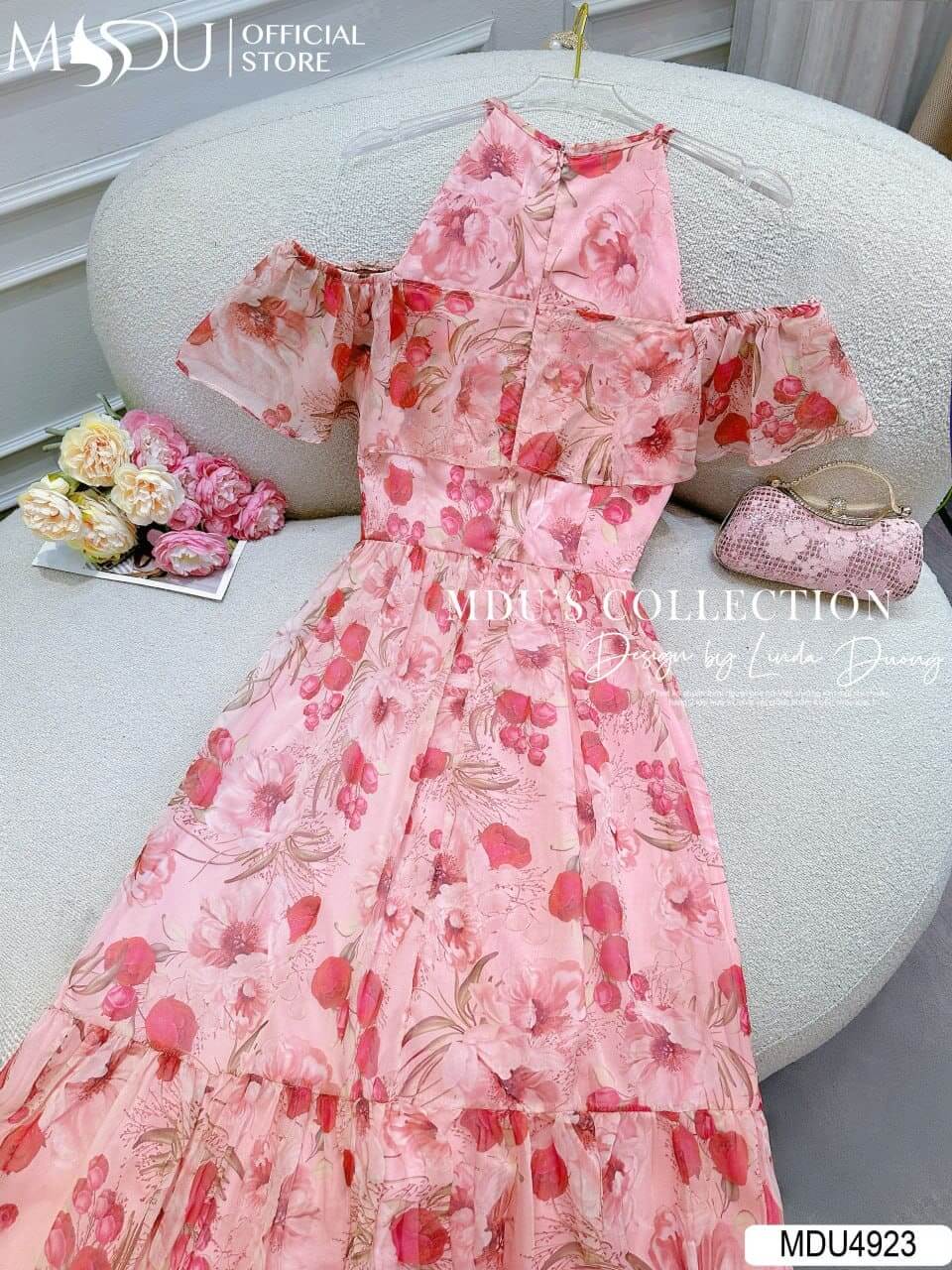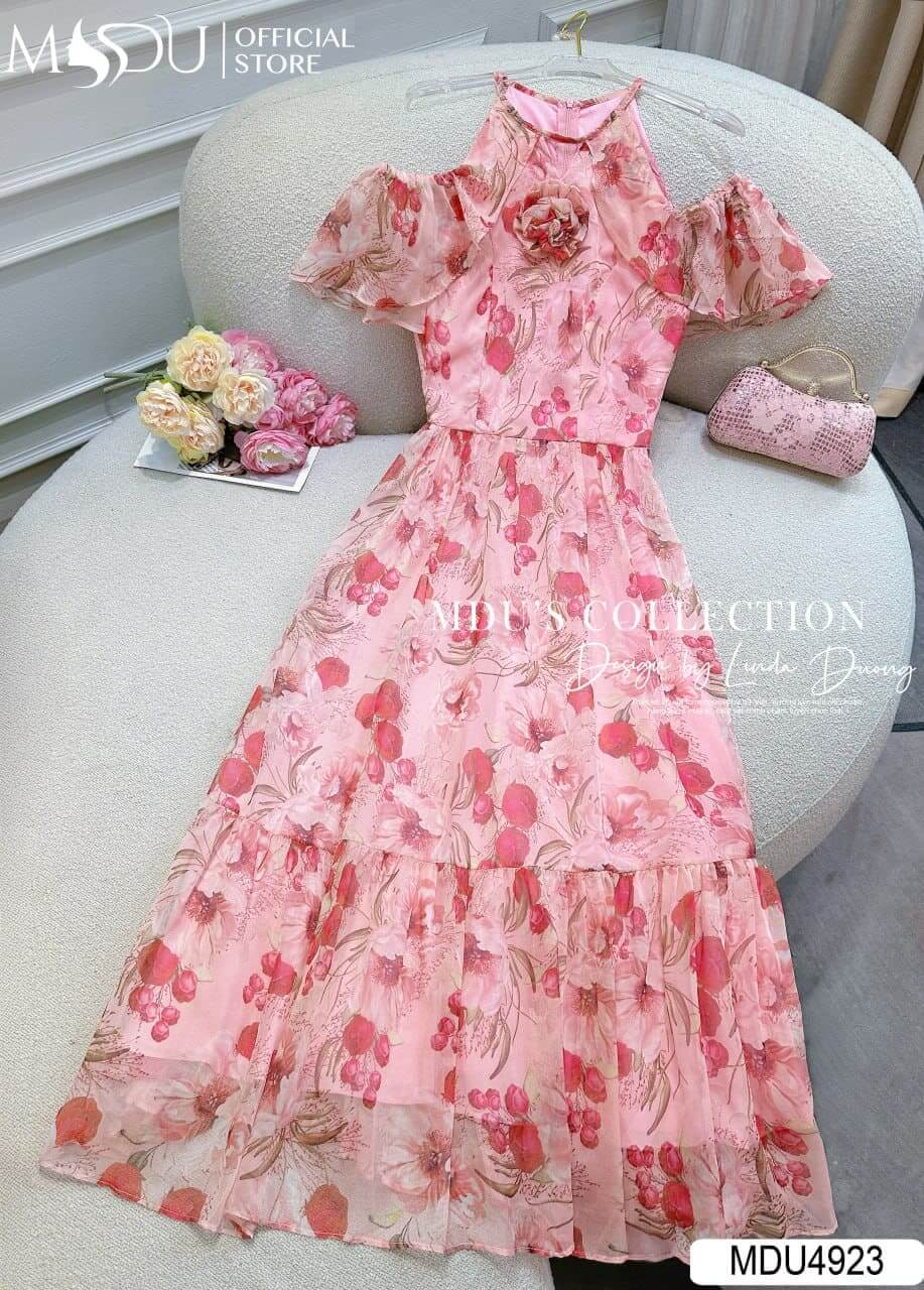 Váy Thiết Kế MDU4923 – Cổ Yếm Vai Khoét, Hoa 3D Trên Nền Tơ Xước Hồng Bay Bổng