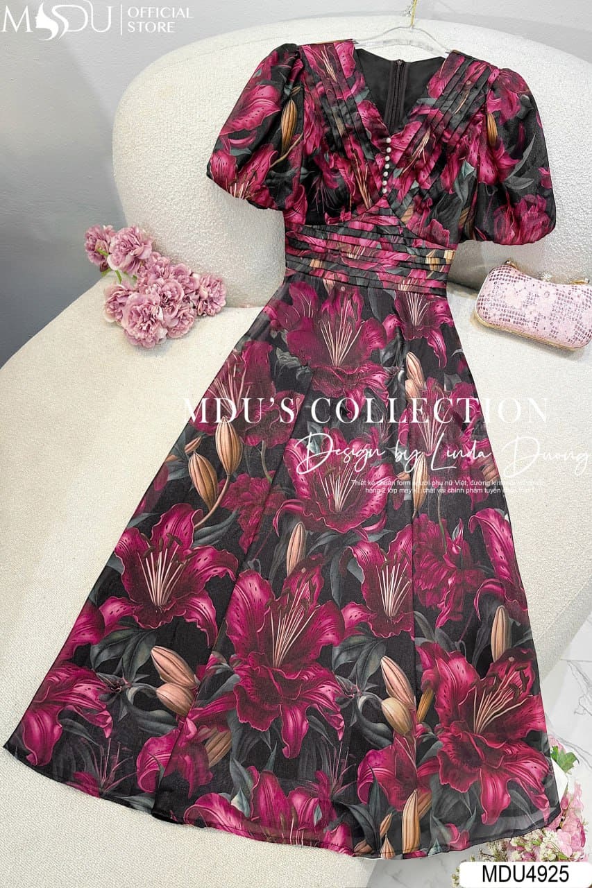 Váy Thiết Kế MDU4925 – Hoa Lily Đỏ Trầm Trên Nền Đen, Cổ V Thanh Thoát Và Đường Ly Tôn Dáng