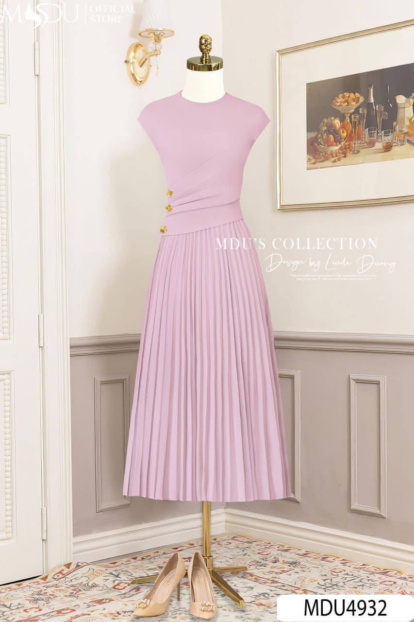 Phần eo chiết khéo léo, nhấn bằng hàng khuy ngọc ánh vàng, tạo điểm nhấn đắt giá cho phần thân trên. Chân váy xếp ly quạt mang lại hiệu ứng chuyển động mềm mại, tôn dáng thon gọn mà vẫn đầy cuốn hút. Phần tay sát nách mang lại sự trẻ trung, phóng khoáng – rất thích hợp cho tiệc nhẹ, sự kiện thanh lịch hoặc những buổi gặp gỡ đầu hè.