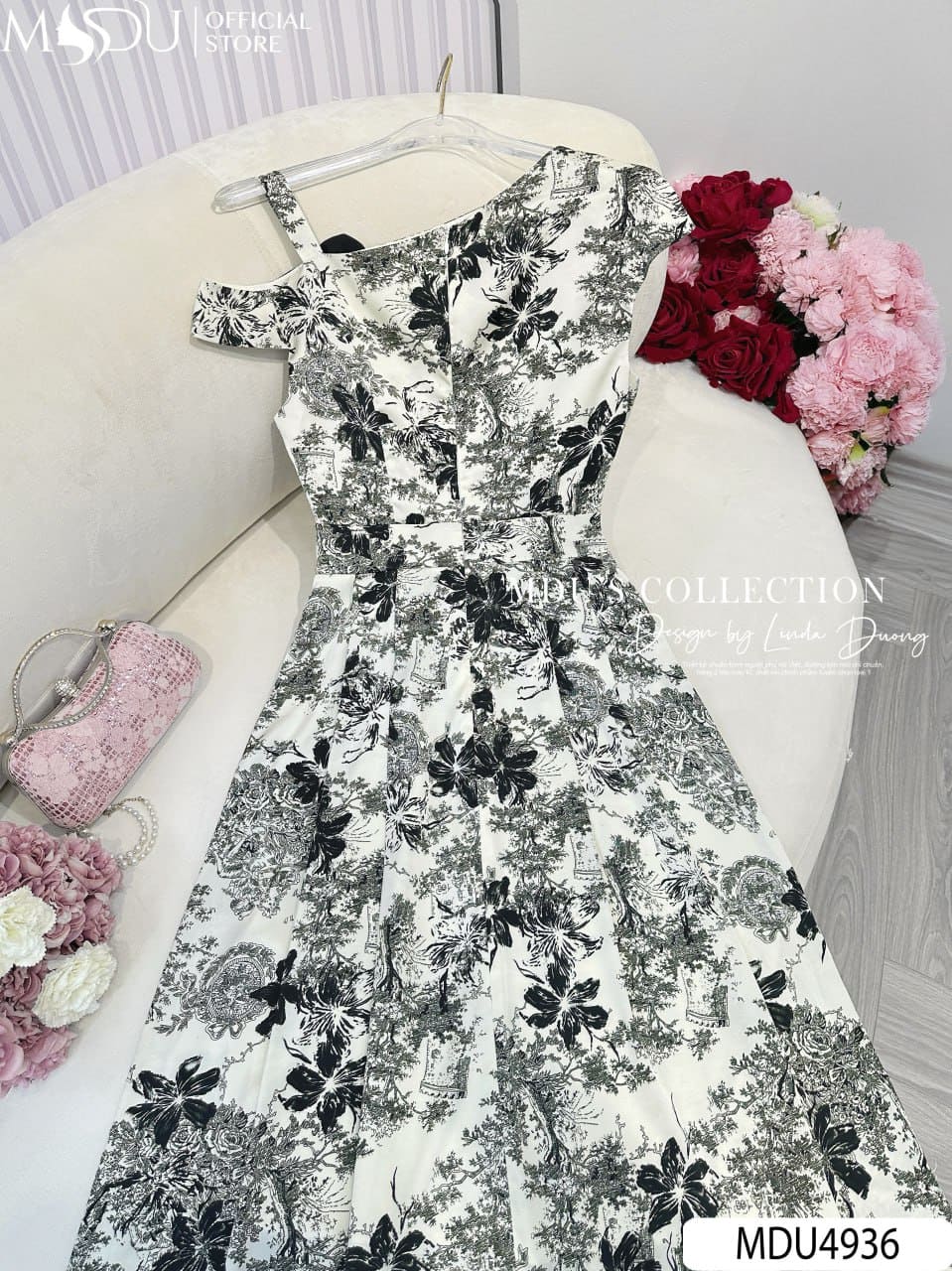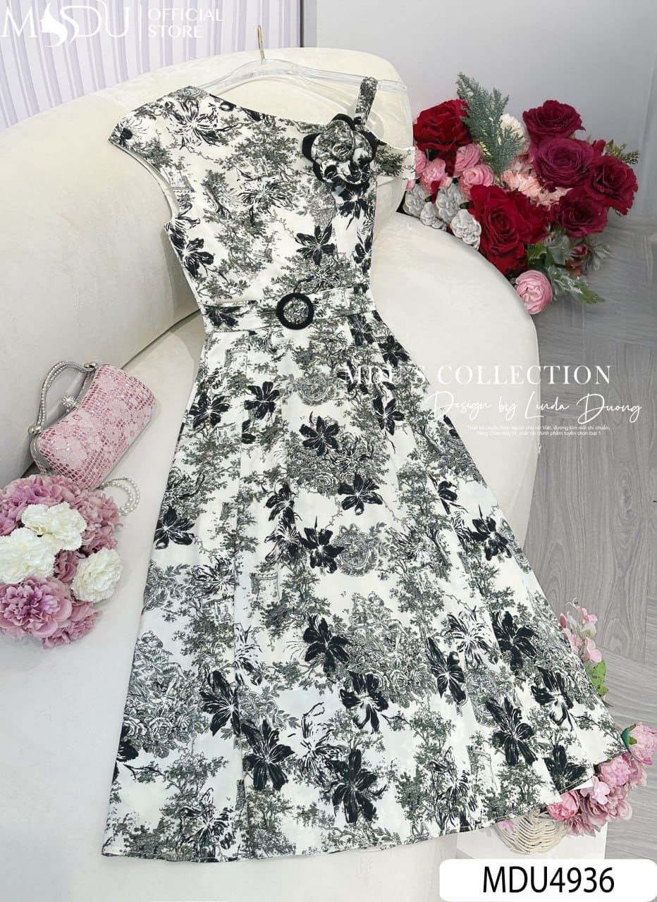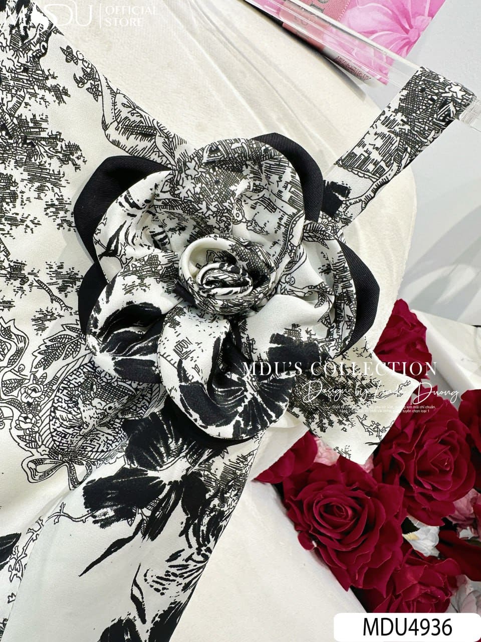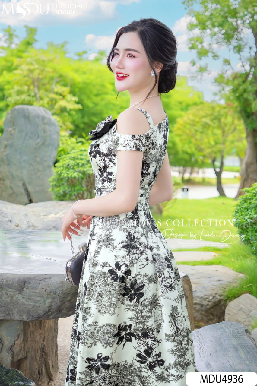 Váy Thiết Kế MDU4936 Lụa Latin Họa Tiết Hoa Đen Cổ Lệch Vai Hoa 3D Thủ Công