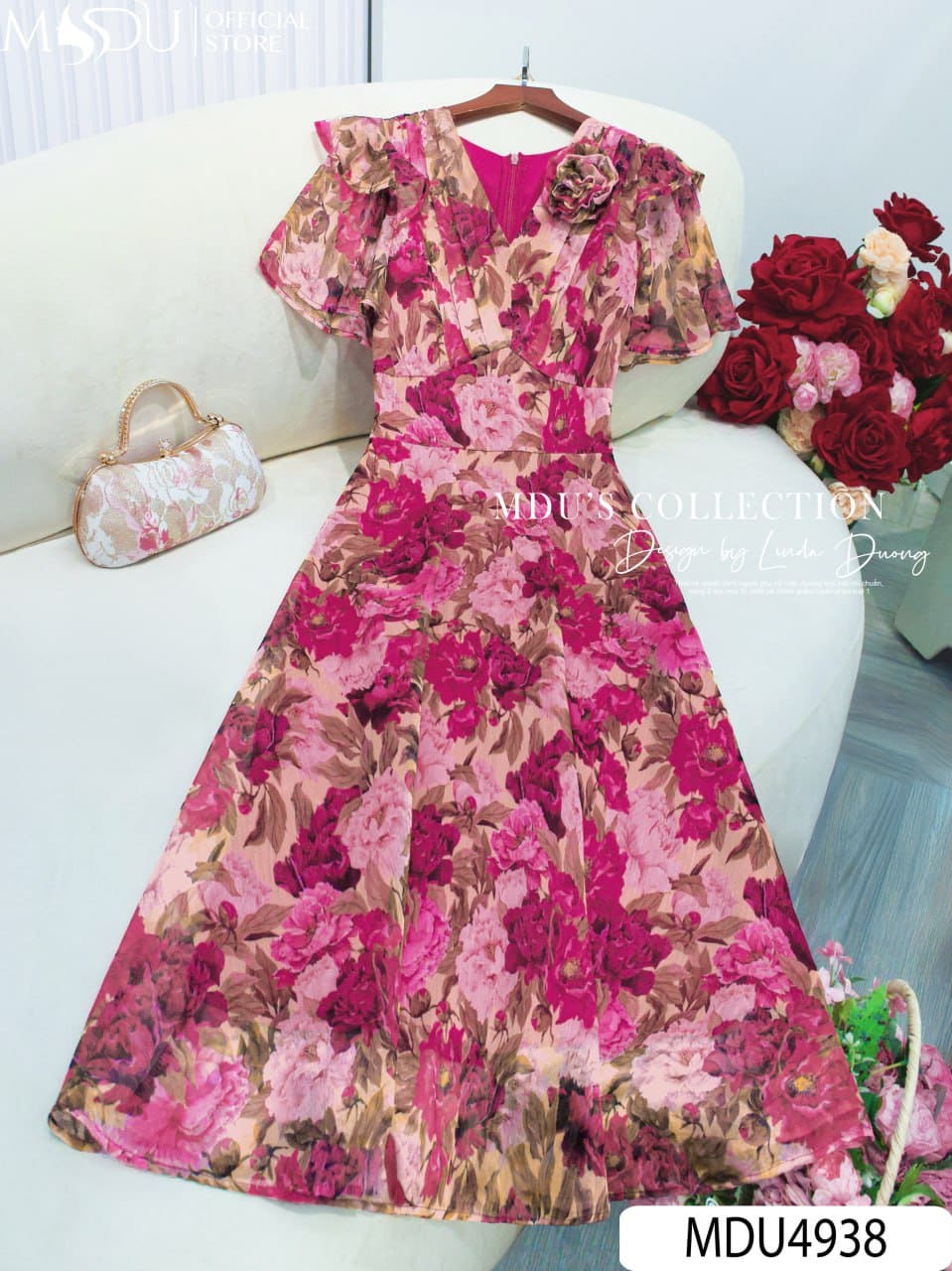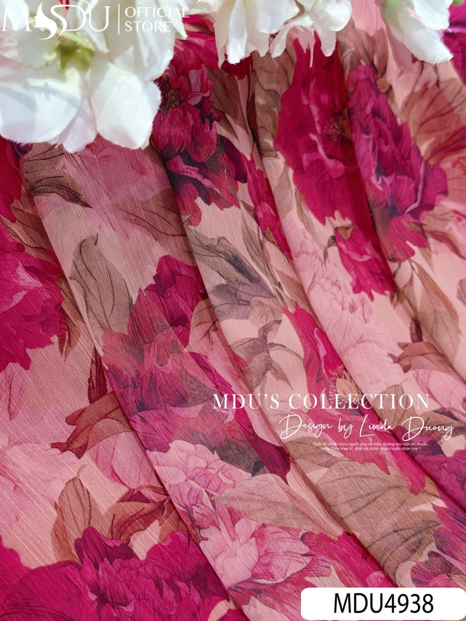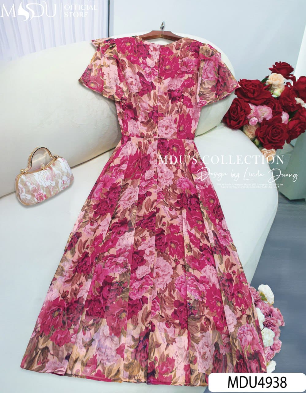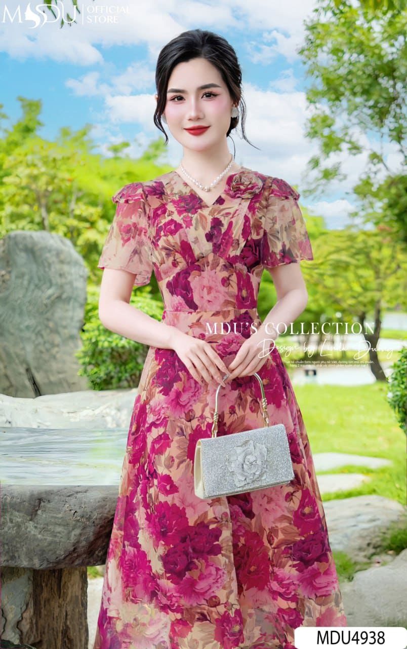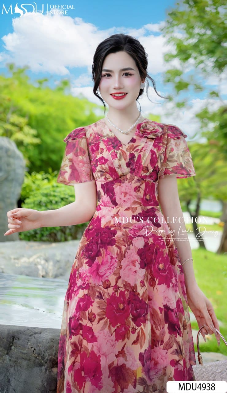 MDU Fashion trân trọng giới thiệu thiết kế MDU4938 – một tuyệt phẩm tôn vinh vẻ đẹp nhẹ nhàng, bay bổng mà vẫn giữ được nét sang trọng và tinh tế. Được chế tác từ chất liệu tơ xước cao cấp, mềm nhẹ tựa sương khói, mẫu váy mang đến cảm giác bay bổng trong từng bước đi mà không làm mất phom dáng chuẩn chỉnh. Trên nền hồng phấn dịu dàng, những họa tiết hoa mẫu đơn đỏ hồng nổi bật như một khu vườn mùa hè nở rộ – gợi cảm, nữ tính và đầy sức sống.