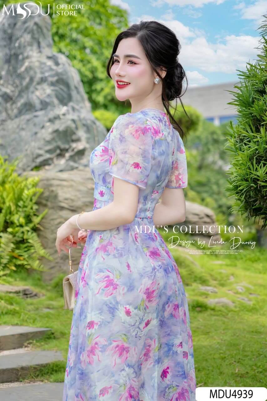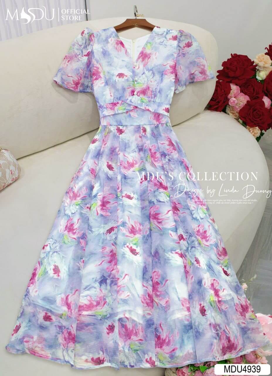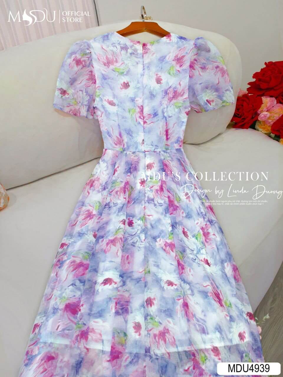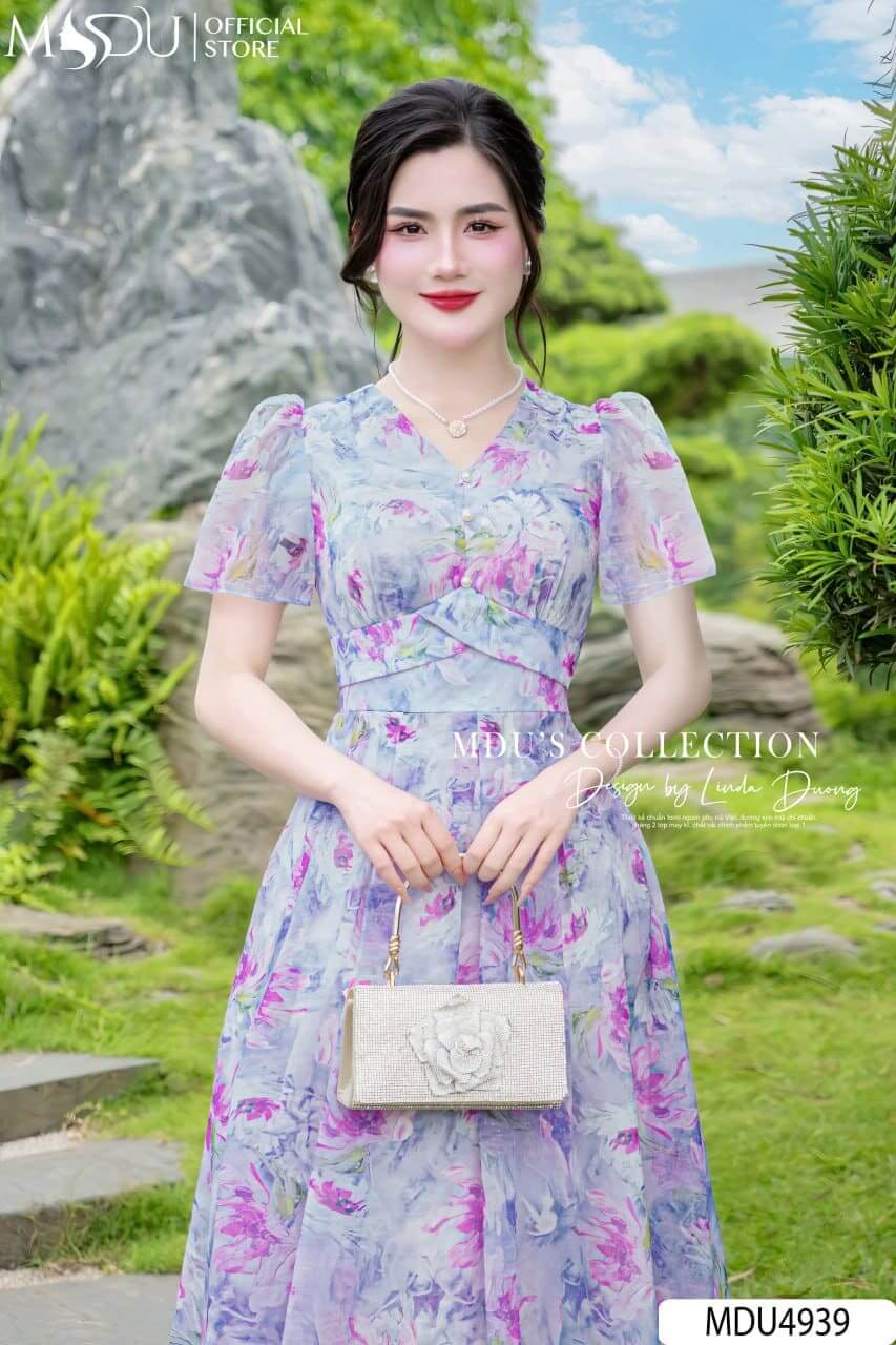 Váy Thiết Kế MDU4939 Tơ Ép Hoa Nổi Dáng Xòe Nhẹ Cổ V Thanh Lịch Tay Bồng Duyên Dáng