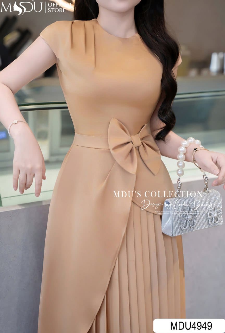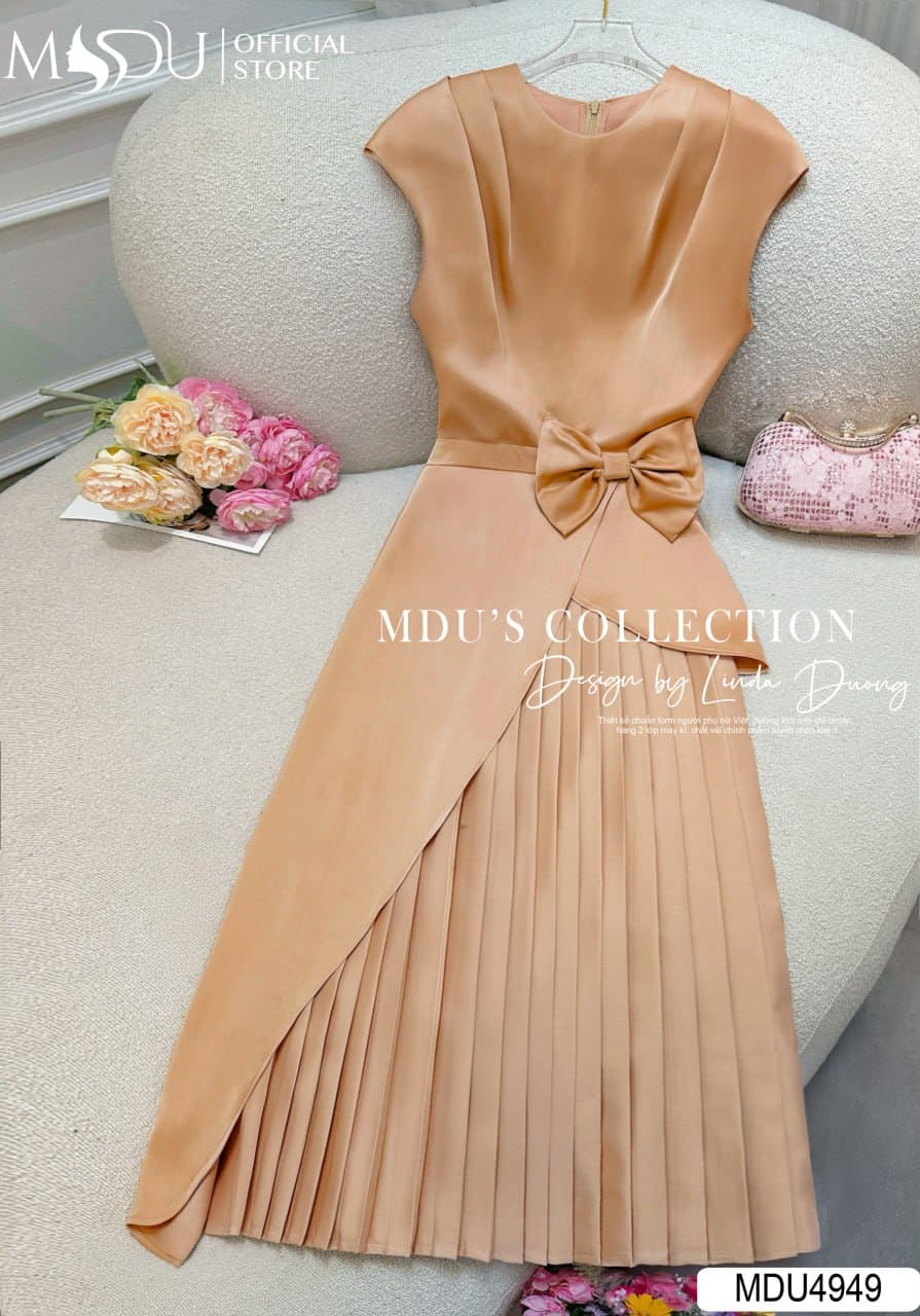 Váy Thiết Kế MDU4949 Lụa Vân Cao Cấp Dáng Xòe Lớp Phủ Chéo Nơ Đính Eo Xếp Ly Thanh Lịch